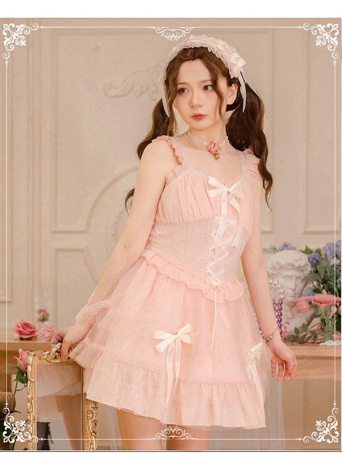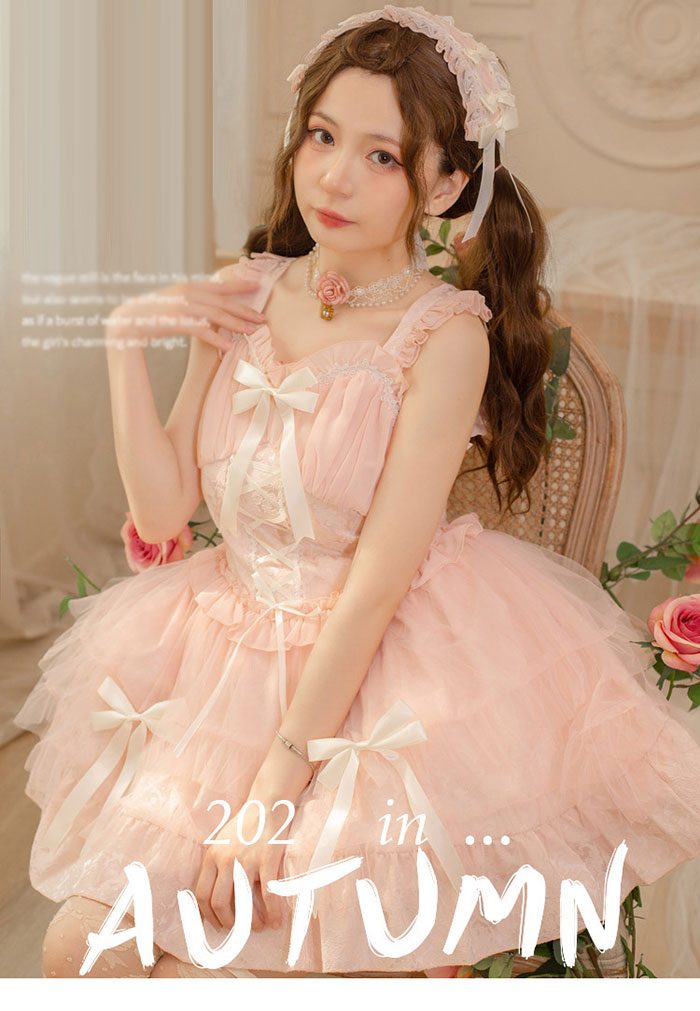 ロリータ ジャンスカ ハイウエスト レースアップ リボン 春夏 キャミワンピース かわいい フェミニン フリル ひざ上丈 ショート丈 ふんわり ゴスロリ 甘ロリ 姫ロリ ワンピース お嬢様 レース キ