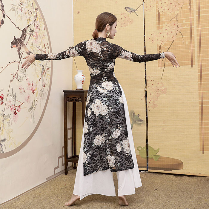 ダンス 衣装 セットアップ ストレッチメッシュ トップス 長袖 7分袖 オールインワン バレエレオタード風 背中開き エレガント ロングパンツ ワイドパンツ ウエストゴム チャイナ風 レディース ダン