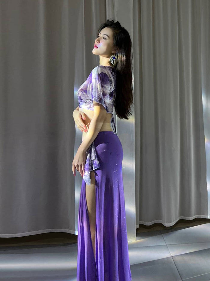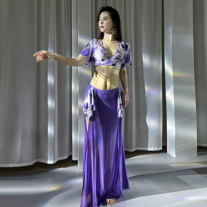 ベリーダンス 衣装 セット レッスン着 セットアップ おしゃれ 星屑 キラキラ メッシュ素材 Vネック スリットオーバー スカート ロング丈 おしゃれ ダンス衣装 ステージ衣装 ダンス 発表会 上下セ