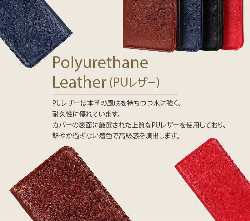 PUレザーは本革の風味を持ちつつ水に強く、耐久性に優れています。カバーの表面に厳選された上質なPUレザーを使用しており、鮮やか過ぎない着色で高級感を演出します。