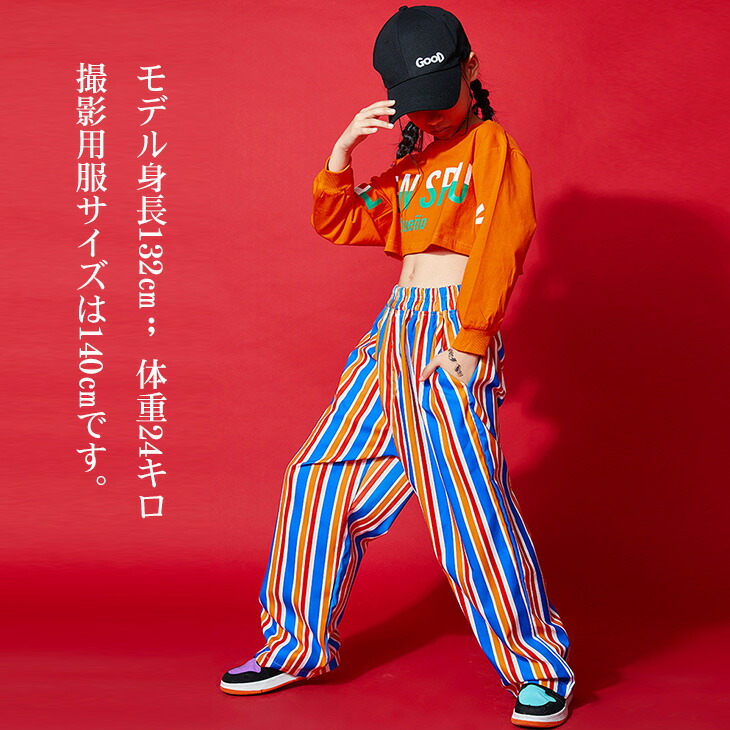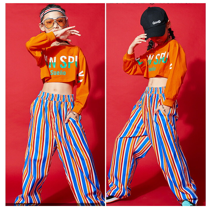 ダンス用 キッズダンス衣装 キッズ衣装 ダンスパンツ ストライプ ショート丈 へそ出し 長袖 ブルー オレンジ 薄手 派手 ボトムス カジュアルロンT プルオーバー 英文字プリント