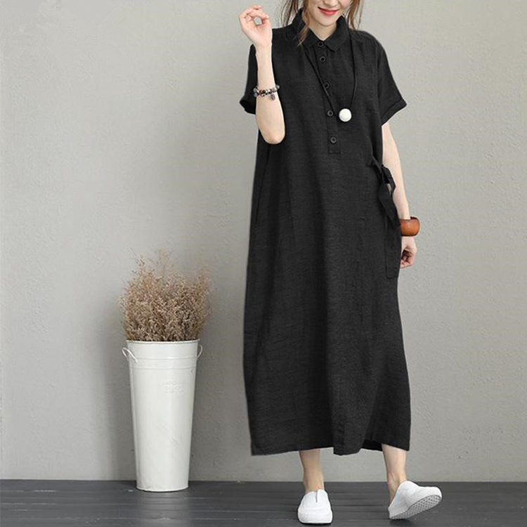 3カラー 8サイズ ロングシャツワンピース 半袖 襟付き ミレモ丈 膝下 シンプル 無地 ブラック ダークグレー カーキ ボタン おしゃれ レディース ミセス 体形カバー 大きいサイズ