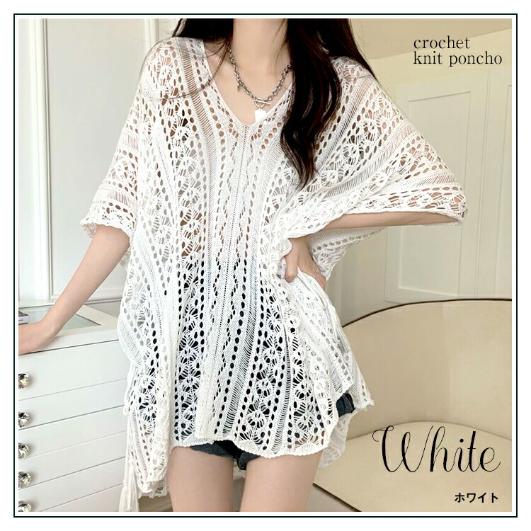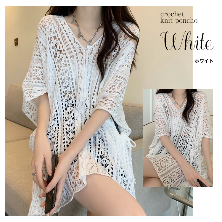 かぎ編みVネックポンチョ風ドルマンチュニック 春夏 透かし編みニット チュニック レディース トップス Vネック 重ね着 メッシュニット サマーニット 薄手 透け感アイテム レディース