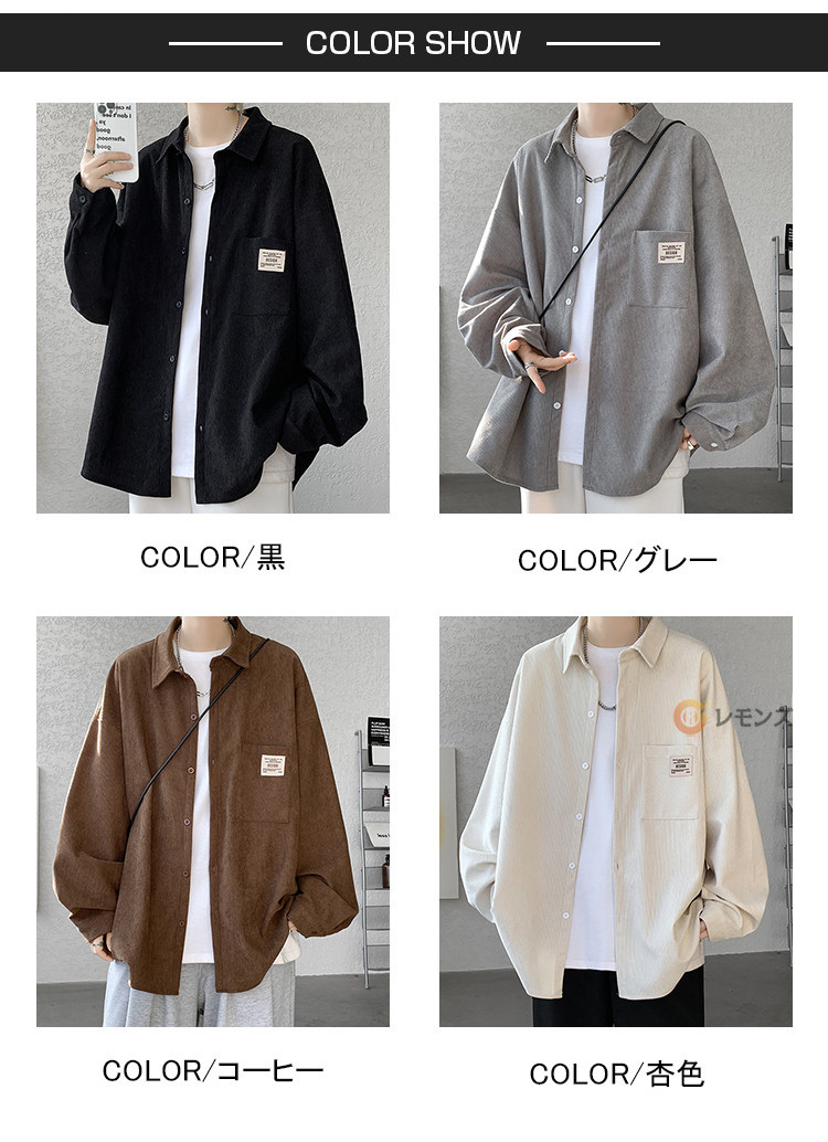 ※※ベルト、飾りやインナーなどは含みません。商品情報商品名 コーデュロイ シャツ メンズ カジュアルシャツ 秋服 長袖シャツ ビッグシルエット シャツ オーバーサイズ 胸ポケット シャツジャケット メンズシャツ ゆったり 羽織り 秋物 春服 ブラウス 無地 コールテンシャツ ファッション素材 ポリエステル100%カラー M|L|XL|2XL|3XL|4XL|5XLサイズ 各サイズの寸法については画像のサイズ表にご参照ください。生産国 中国包装について 環境保護の観点から、「簡易包装」を推進しております明細書について 当店ではエコロジーと個人情報流出防止のため、ご指示の無い限り明細書を発行しておりません。