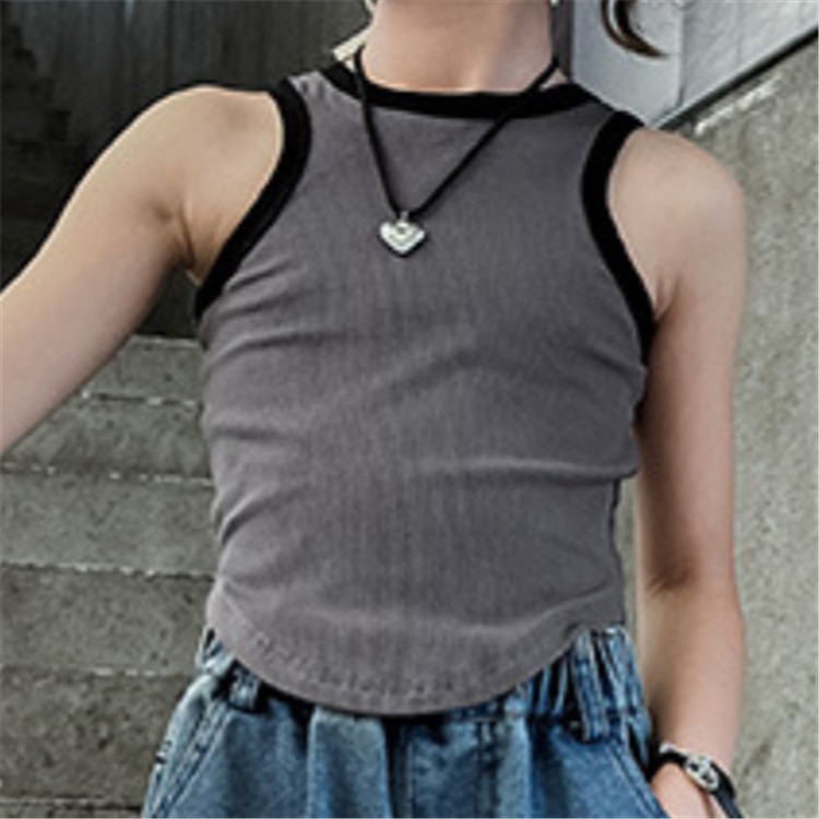 horizontal-key: バラ色タンクトップ グレータンクトップ デニムパンツ