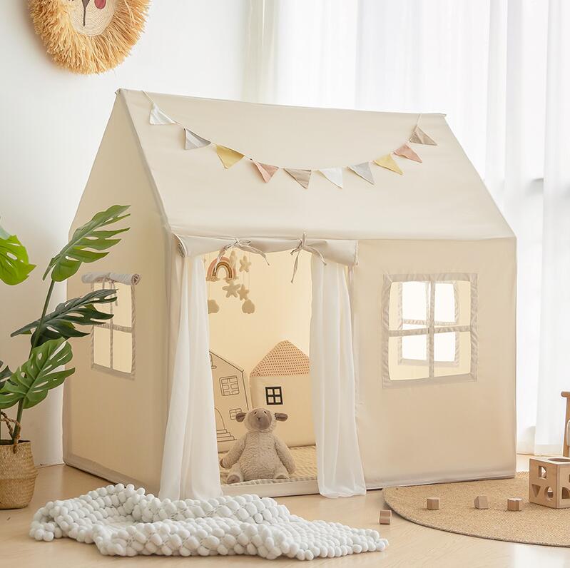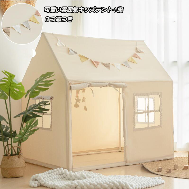 キッズテント 子供部屋 プレゼント 子供テント キッズ プレイテント 組み立て簡単 室内室外 小屋 厚手フロアマット カーテン 旗 PVCブラケット 窓つき 通気性 扉つき