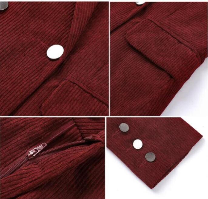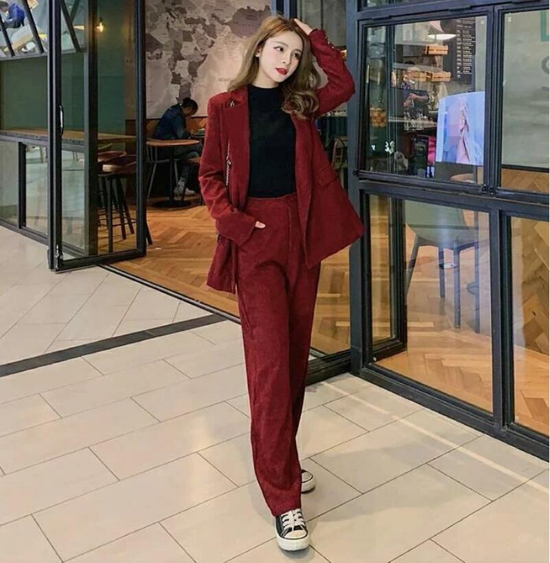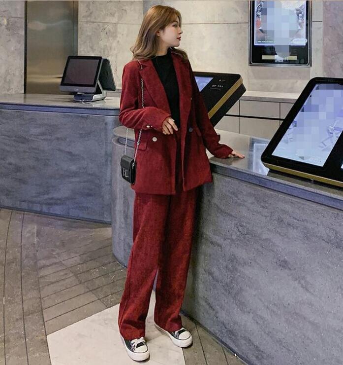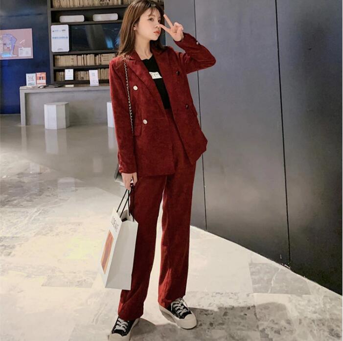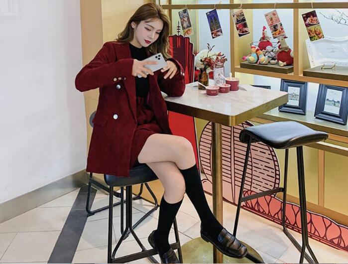 レディーススーツ 3点セット 上下セット ダブルボタンスーツ セレモニーフォーマル カジュアル パーティー スーツ コーデュロイ レトロ ジャケット+セーター+パンツ スカート ワイン赤