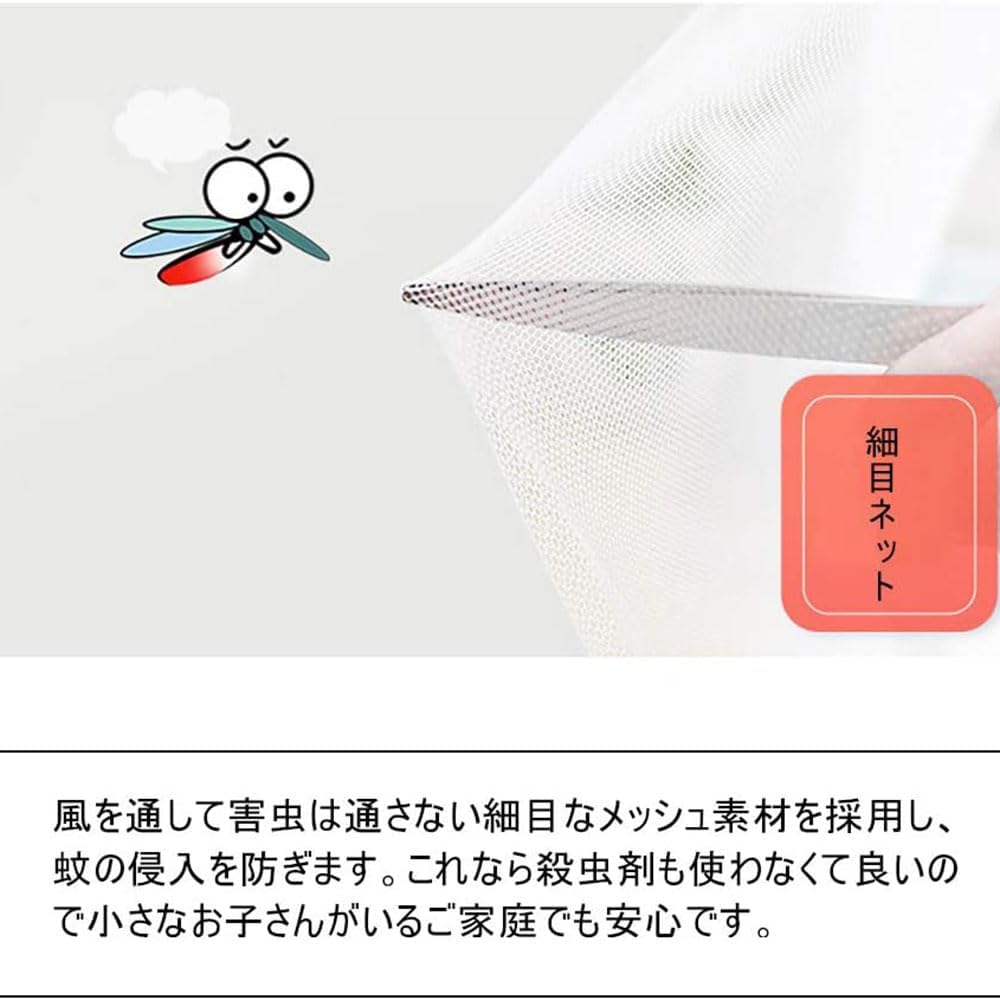 【細目なメッシュ素材】風を通して害虫は通さない細かなメッシュ素材を採用、細かいネットが蚊の侵入を防ぎます。これなら薬剤も使わなくて良いので小さなお子さんがいるご家庭でも安心です。柔らかいな色がお部屋の雰囲気に合わせやすく、長年にわたってご使用いただけます。