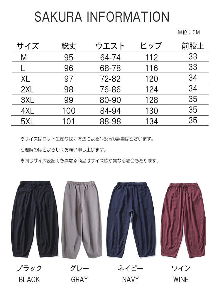 商品情報素材 綿 麻 ポリエステル裏地 なしポケット あり生地の伸縮性 伸縮しません生地の透け感 淡色が少しありますカラー 黒(black)、グレー(gray)、ネイビー(navy)、ワイン(wine)サイズ M/L/XL(LL)/2XL(3L)/3XL(4L)/4XL(5L)/5XL(6L)サイズ表にご参考まで生産国 中国包装について 環境保護の観点から、「簡易包装」を推進しております明細書について 当店ではエコロジーと個人情報流出防止のため、ご指示の無い限り明細書を発行しておりません。