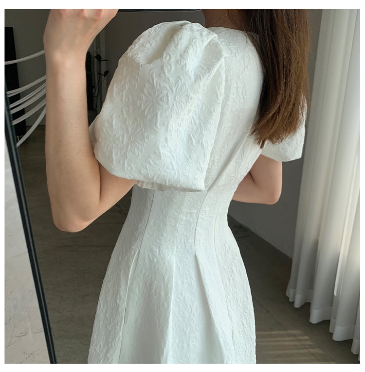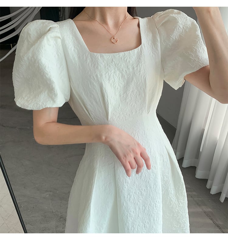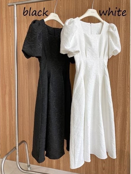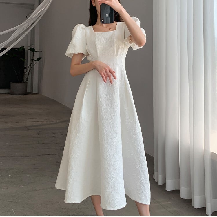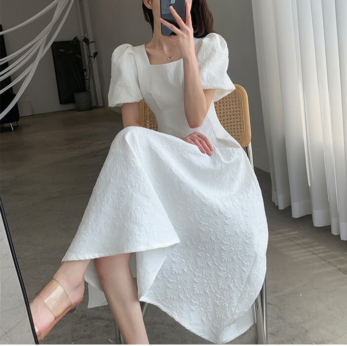 スクエアネック パフスリーブ ワンピース 半袖 ハイウエスト Aライン フレア 刺繍 モノトーン 薄手 シャガード アラベスク ひざ下丈 ミモレ丈 かわいい 大人可愛い きれいめ シンプル