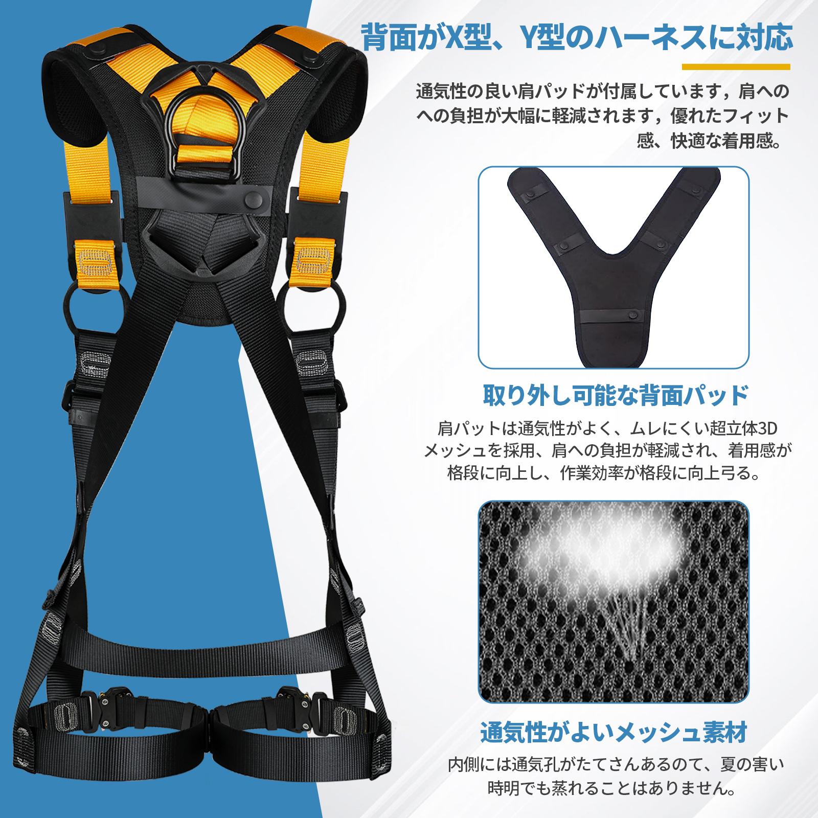 【調整可能なフルハーネス 新規格】:高所での作業を容易にするためには、適切なフィットが重要です。当社のハーネス安全帯は、ユーザーが重量内で適切にフィットするように 6 点の調整を提供します。ショックアブソーバーはついていますので、一旦落下時墜落時、ハーネスは衝撃を体全体に分散し、人体への負担を軽減します。フルハーネス安全帯 新規格 セットは、安全で快適、着やすく、あらゆる体格の方に適しています。ハーネスが適切にフィットするように、すべてのバックルが接続されていること、レッグ ストラップとショルダー ストラップがぴったりと合っていること、チェスト ストラップが胸部の中央にあることを確認してください。