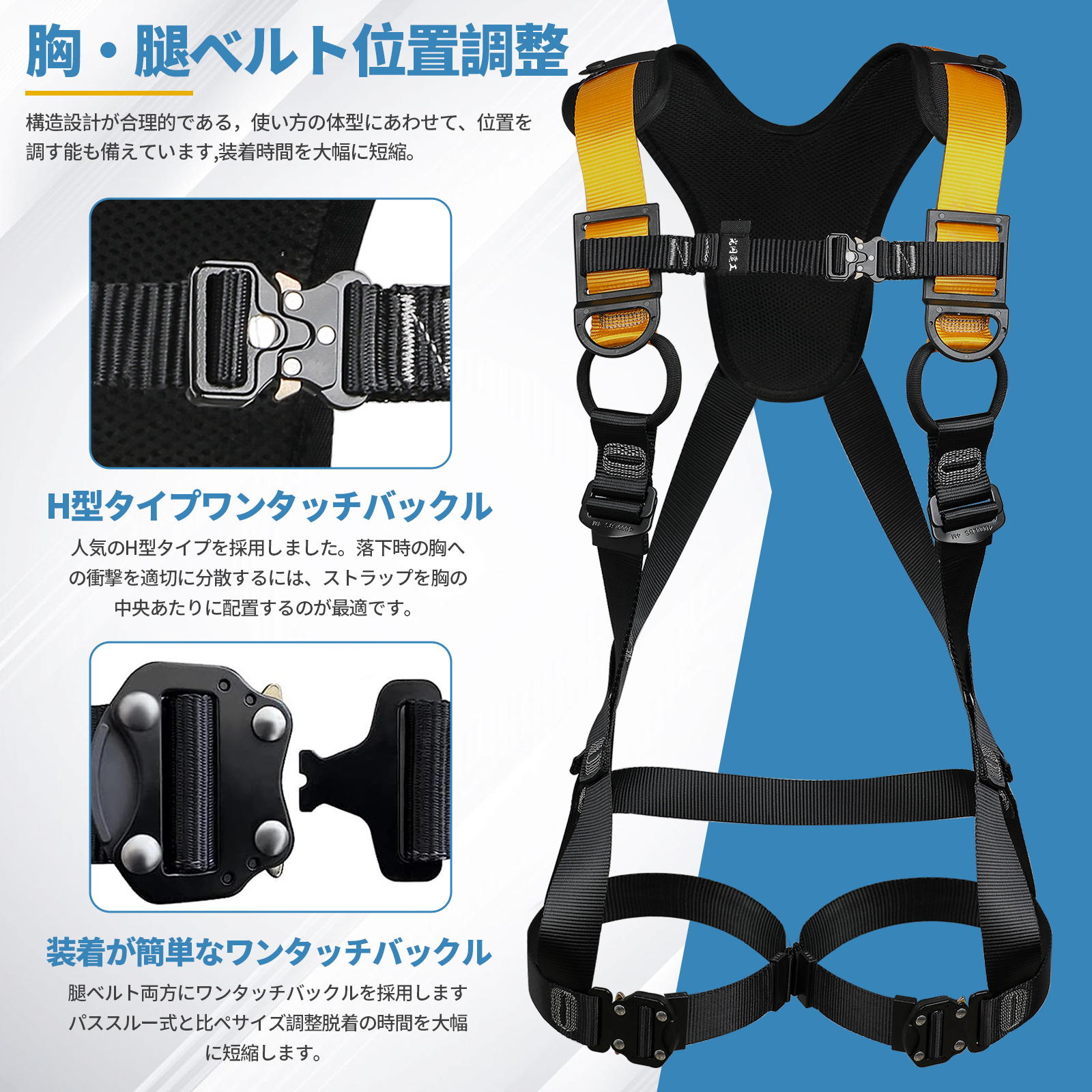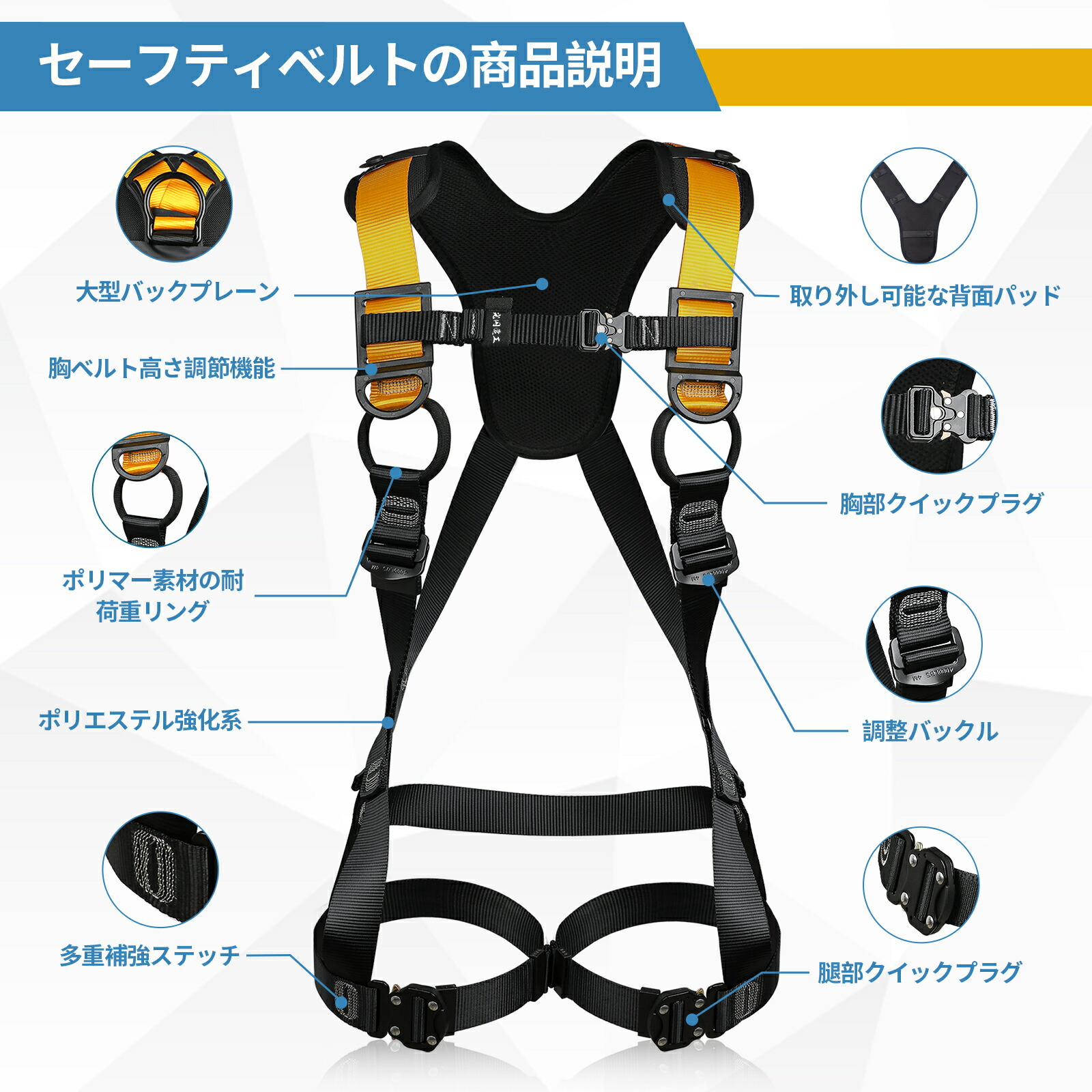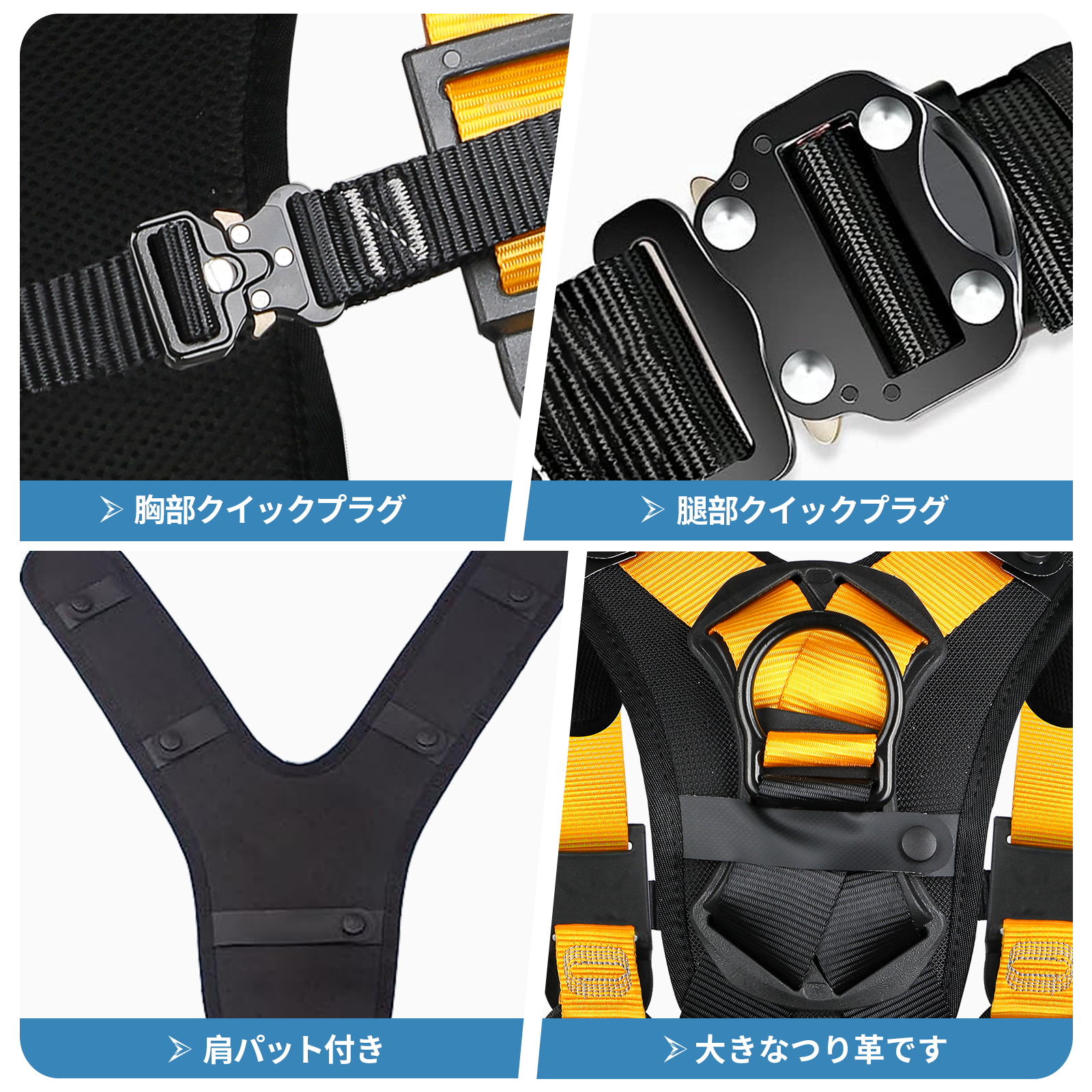 【ご注意】フルハーネス安全帯 新規格 セット、高所作業やクライミングなどは非常に危険ですので、自己の行動と判断に責任を持ち、適切なトレーニング(技術および安全対策知識)を事前に習得してからご使用ください。使用方法が誤っていたり、メンテナンスが不適切な場合、重大な事故につながる可能性があることにご注意ください。私たちの店では、常に高品質の製品とサービスを提供することに注力しています。商品について何かアドバイスがございましたら、ぜひメールにてお知らせください。