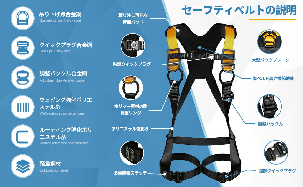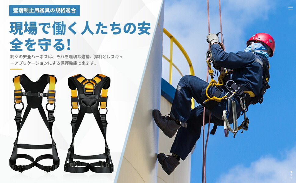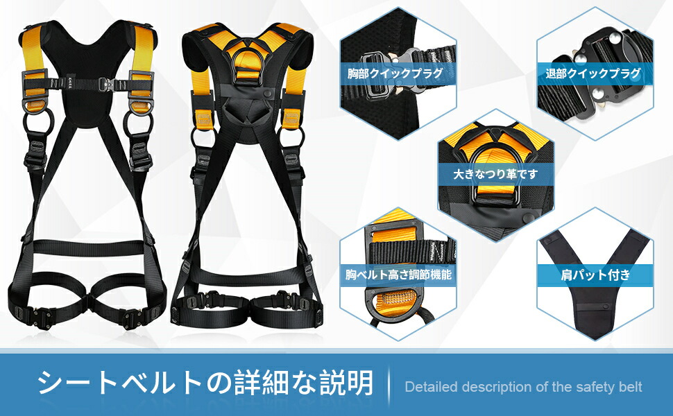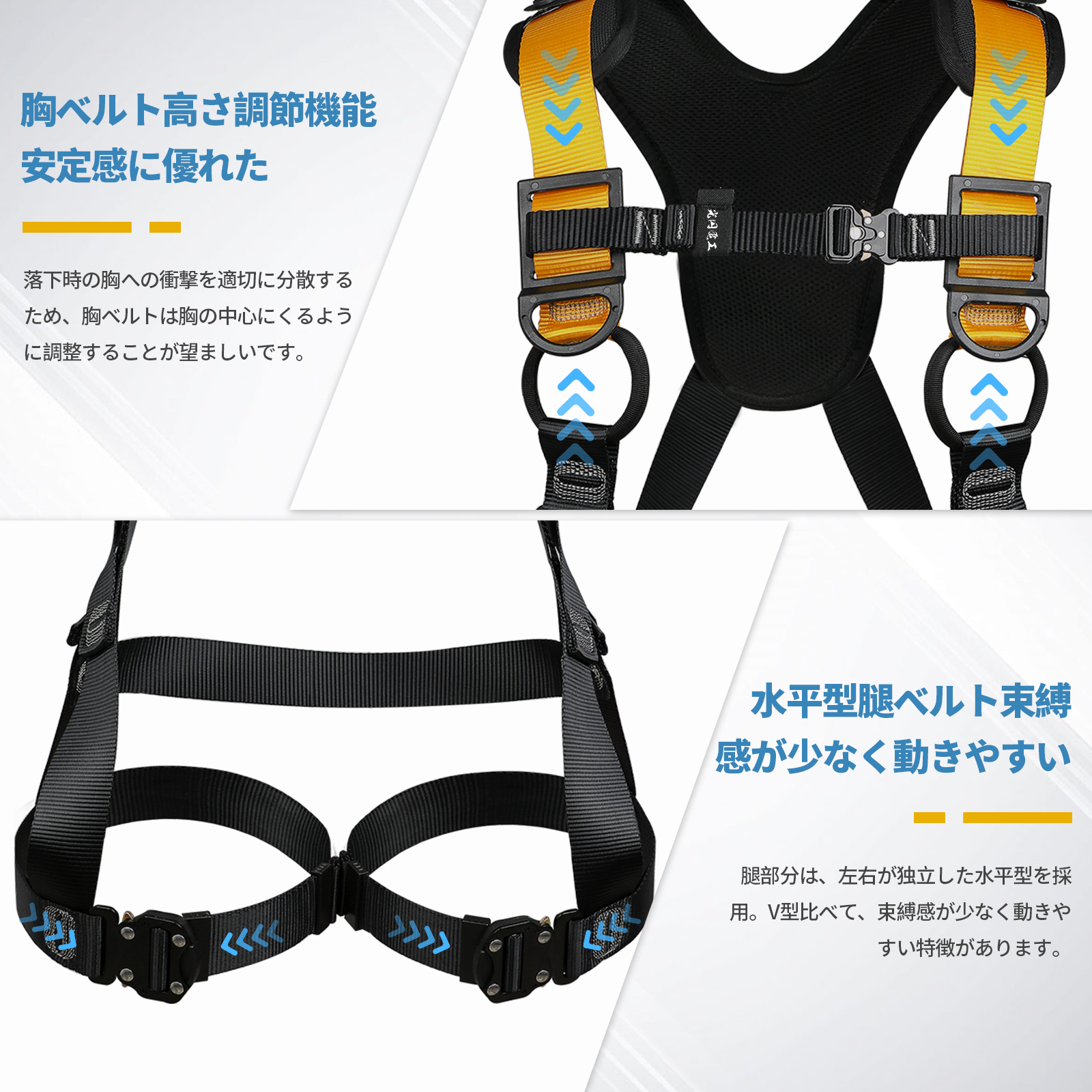 【ご注意】フルハーネス安全帯 新規格 セット、高所作業やクライミングなどは非常に危険ですので、自己の行動と判断に責任を持ち、適切なトレーニング(技術および安全対策知識)を事前に習得してからご使用ください。使用方法が誤っていたり、メンテナンスが不適切な場合、重大な事故につながる可能性があることにご注意ください。私たちの店では、常に高品質の製品とサービスを提供することに注力しています。商品について何かアドバイスがございましたら、ぜひメールにてお知らせください。