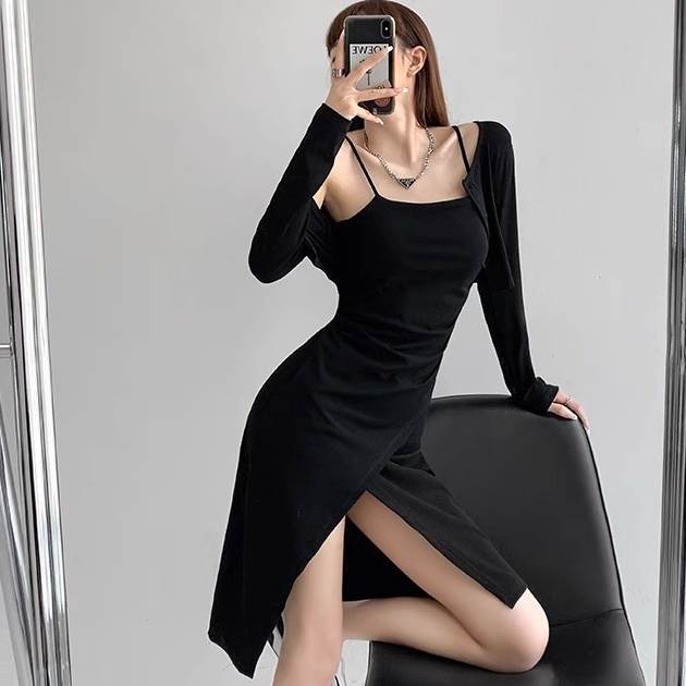 2点セット トップス ワンピース カーディガン レディース 羽織 前開き 膝丈 アシンメトリー 袖なし ノースリーブ 長袖 タイト スリム 細身 スマート フェミニン ストリート スリット
