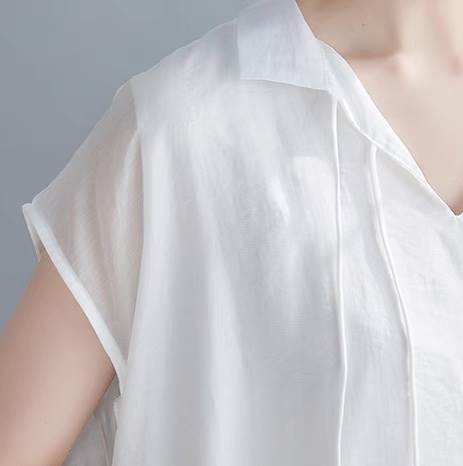 透け感のある生地が大人可愛い印象を引き立て、シンプルでカジュアルなスタイルがレトロでこなれ感を演出。