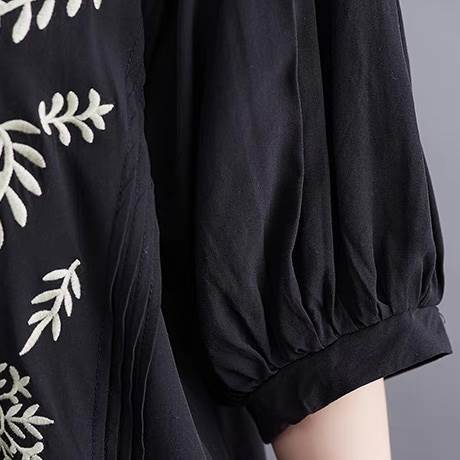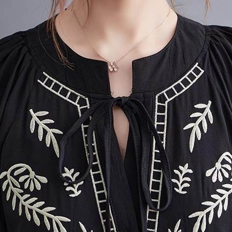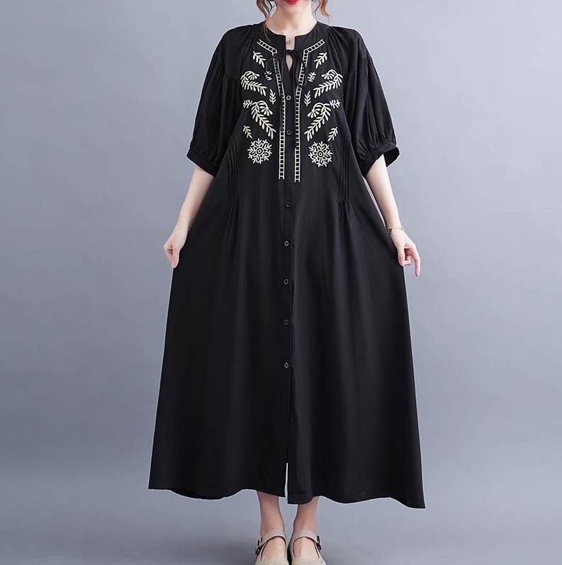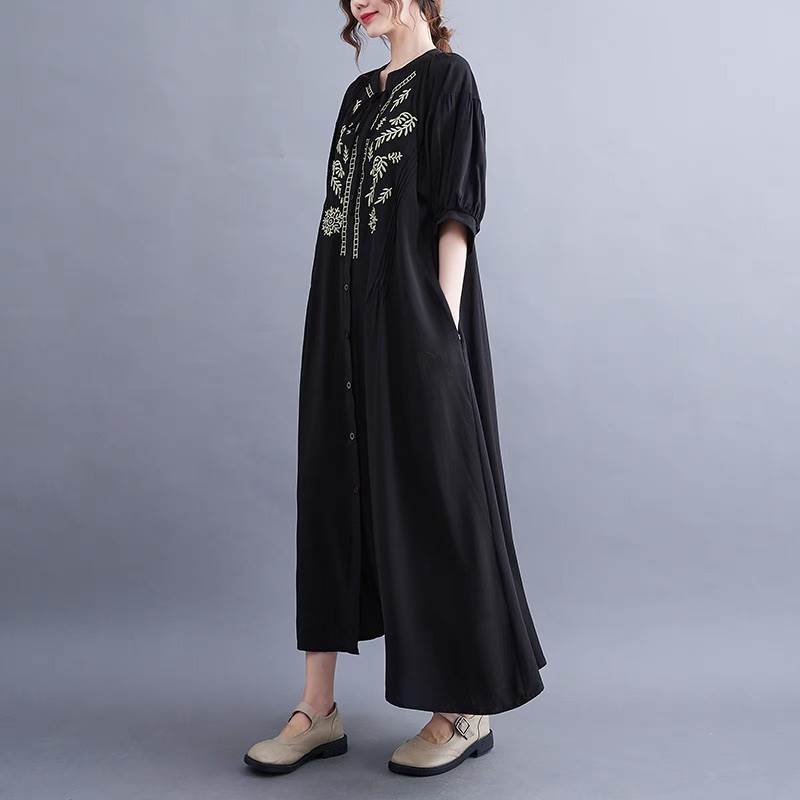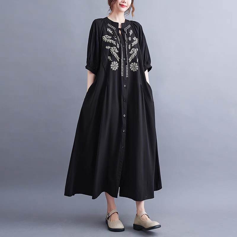 ワンピース レディース シャツワンピ フレア 前開き ロング 半袖 5分袖 ラウンドネック Aライン フェミニン ストリート 刺繍 リボン ウエストマーク ポケット ハイウエスト 異国風 かわいい 大人可愛い カジュアル おしゃれ レトロ アジアン エスニック エキゾチック ラフ ガーリー ルーズ ヴィンテージ ラブリー キュート ロマンティック ナチュラル 春 夏 お出かけ イベント リゾート 旅行 ビーチ 女子会 休日 バカンス ライブ フェス 普段使い 着回し L XL ゆったり ゆる 黒 ブラック
