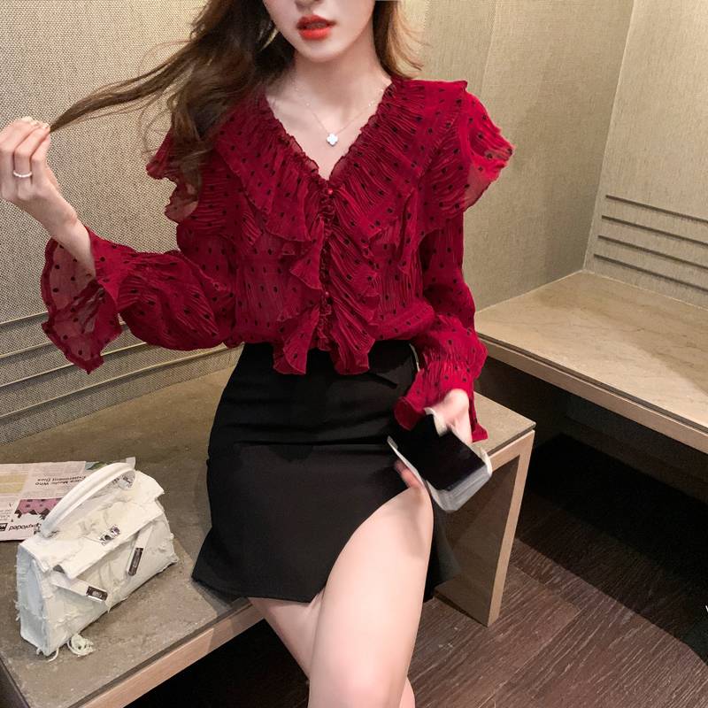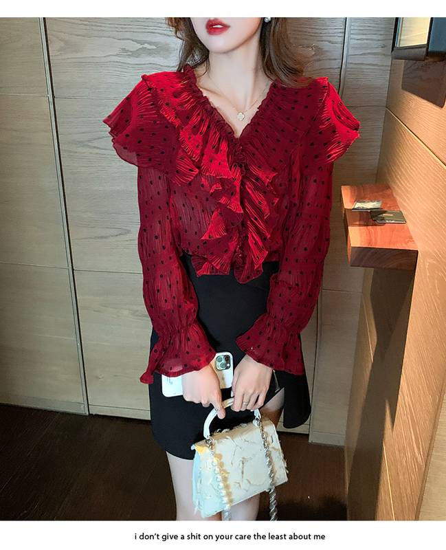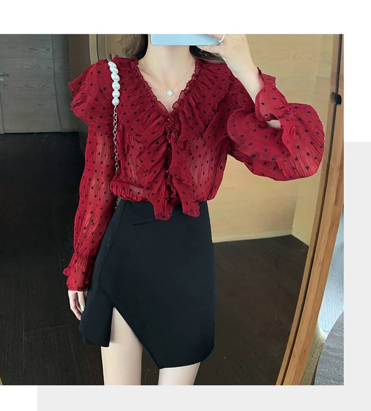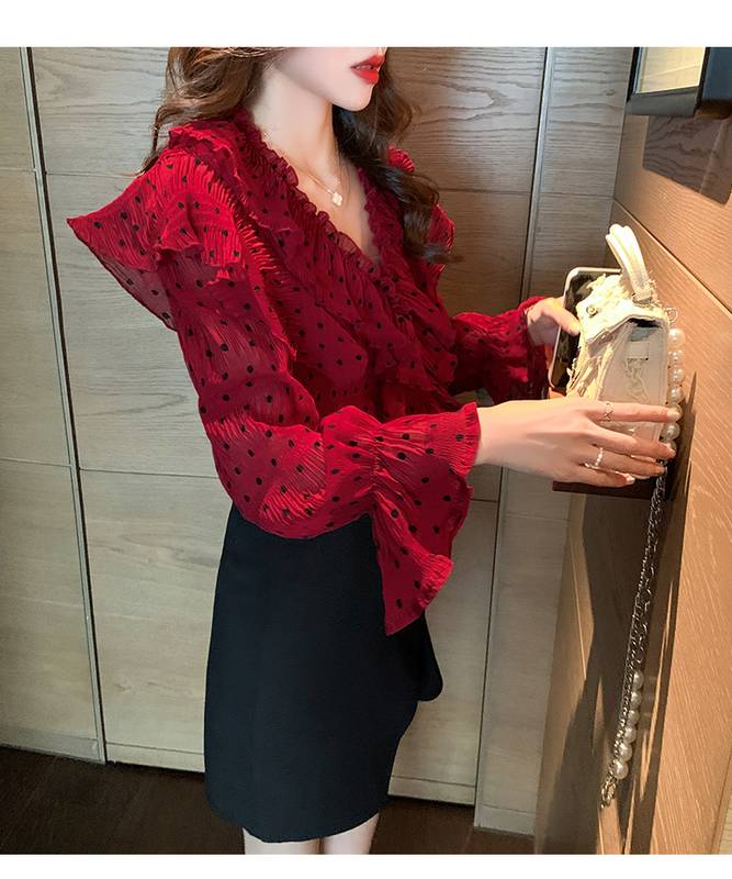 トップス レディース ブラウス シャツ 長袖 秋 冬 ドット柄 レッド フリル Vネック イベント 休日 お出かけ デート コーデ パーティー イベント ファッション エレガ