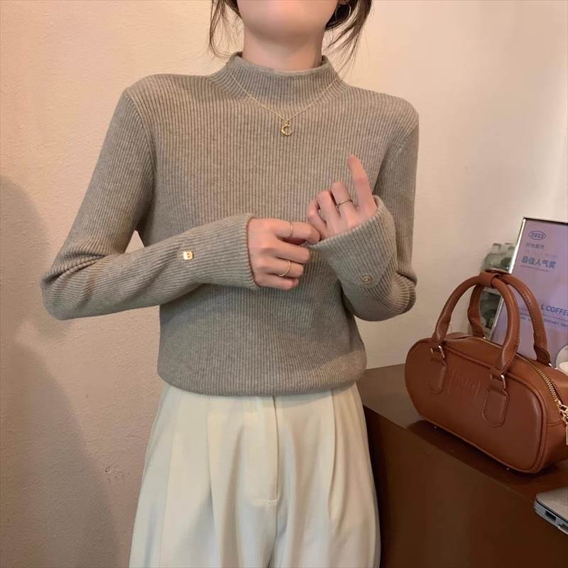 ボトルネックとボタンがアクセントで、シンプルでありながらフェミニンさを引き立てる一枚。