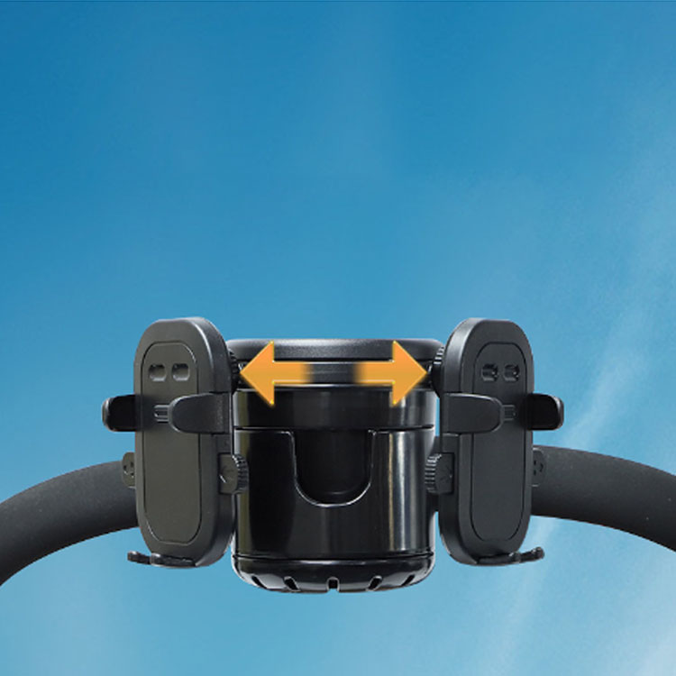 【スマホホルダー付き】スマホスタンドもあり、移動中もスマホを自由に使えます。スマホスタンドもあり、移動中もスマホを自由に使えます。クリップが360°回転し、縦・横自由に置けます。又、左右にスライドするので、左利き・右利きも対応します。ワンタッチストレッチで置け、簡単にセッティング出来ます。画面上にもそのまま操作が可能です。強力バネ内蔵で幅5.6~9cmのスマホを挟む事が出来ます。