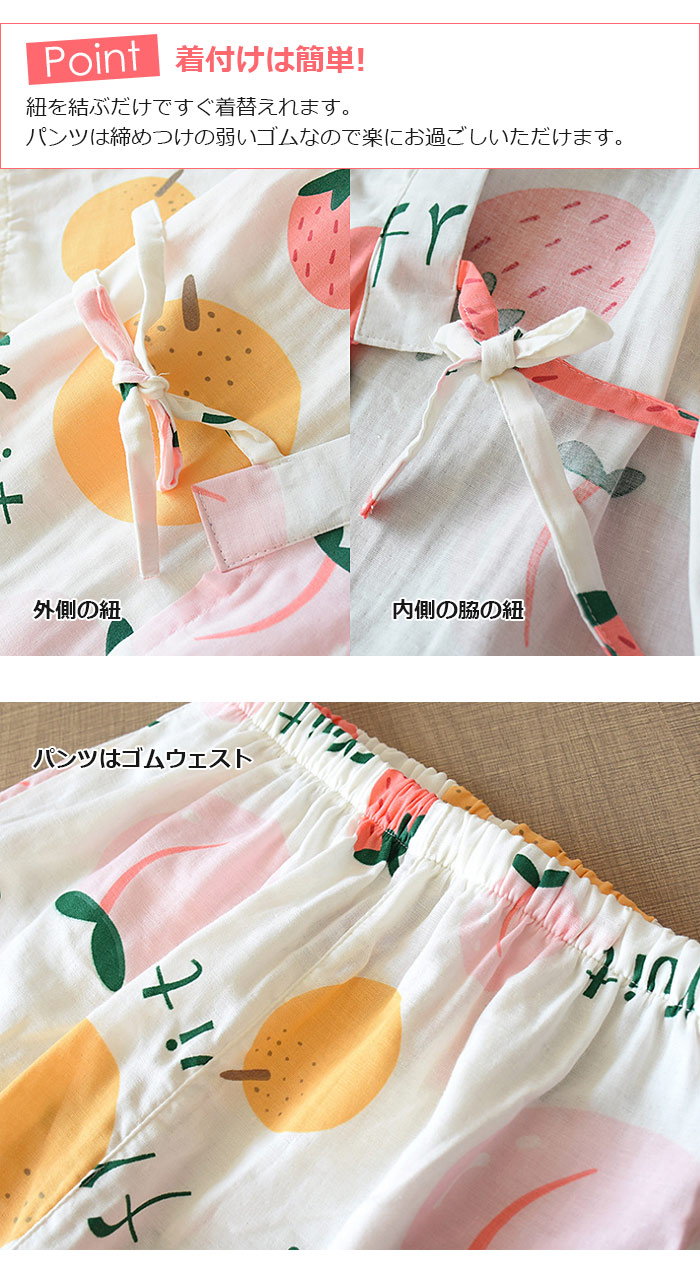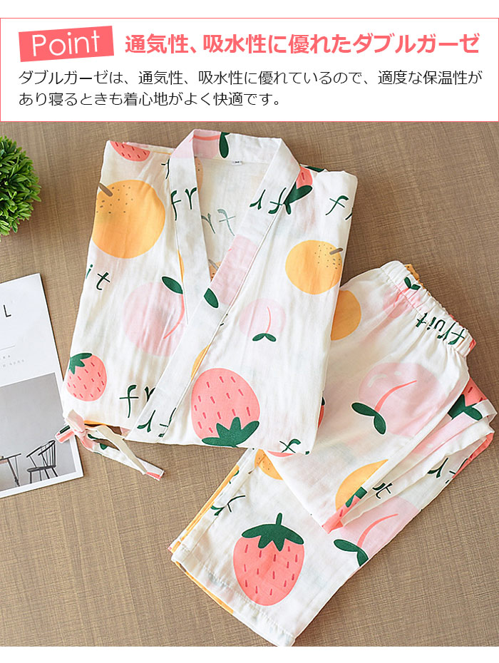 パジャマ 綿100% レディース 春夏 ガーゼパジャマ 前開き 可愛い イチゴ柄 和風 ルームウエア 上下セット 部屋着 綿 セットアップ 2点セット 七分丈 2重ガーゼ 半袖 春 夏涼しい寝間着 ギフト 結婚式お祝い 敬老の日