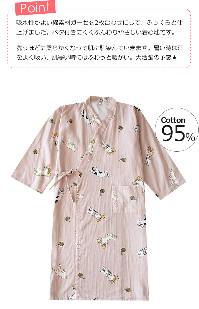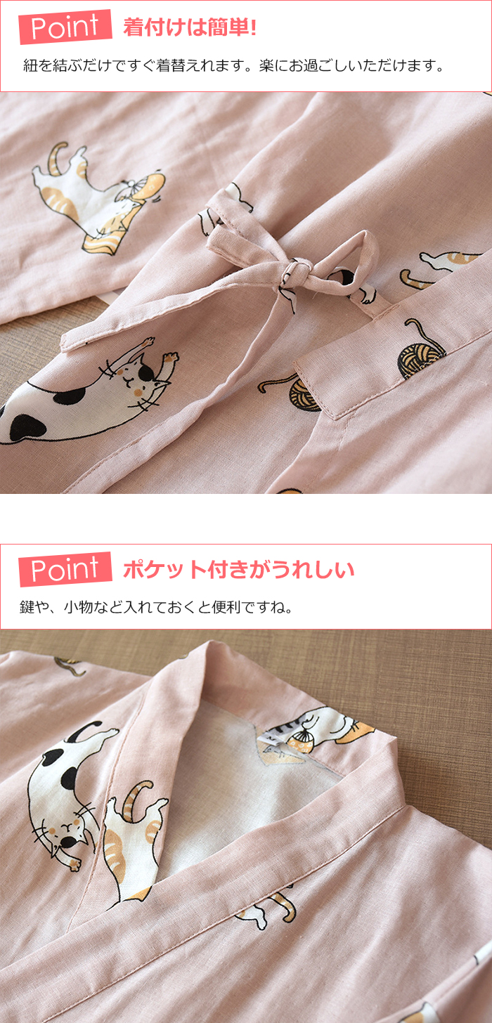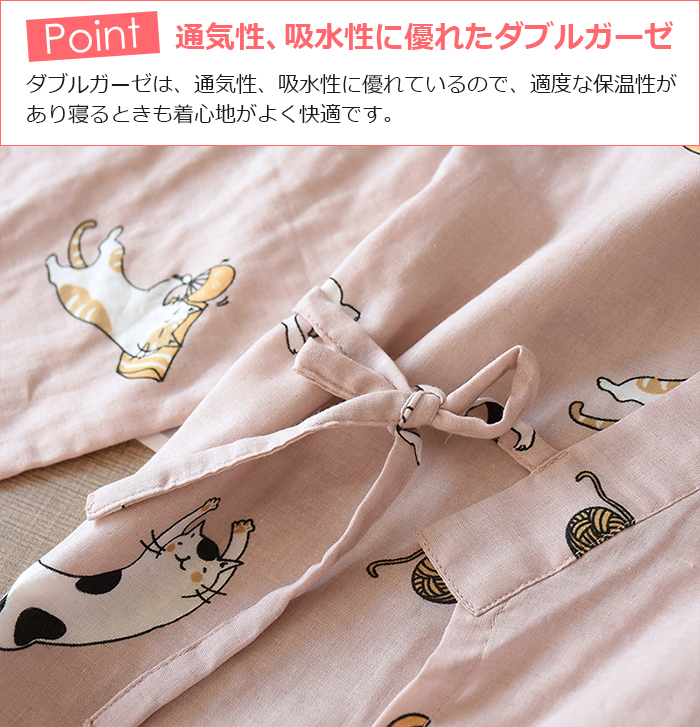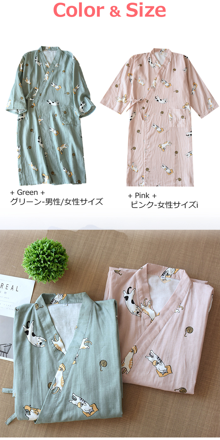 即納 男女兼用 パジャマ 綿 部屋着ワンピース ルームワンピース カップルペア 2重ガーゼ ペア 前開き 寝巻き 寝間着 インナー 前合わせ ウエア ガーゼパジャマ 入院用パジャマ 綿100% 夏 薄手 膝丈 かわいい 猫柄 グリーン/ピンク M/L 送料無料 敬老の日