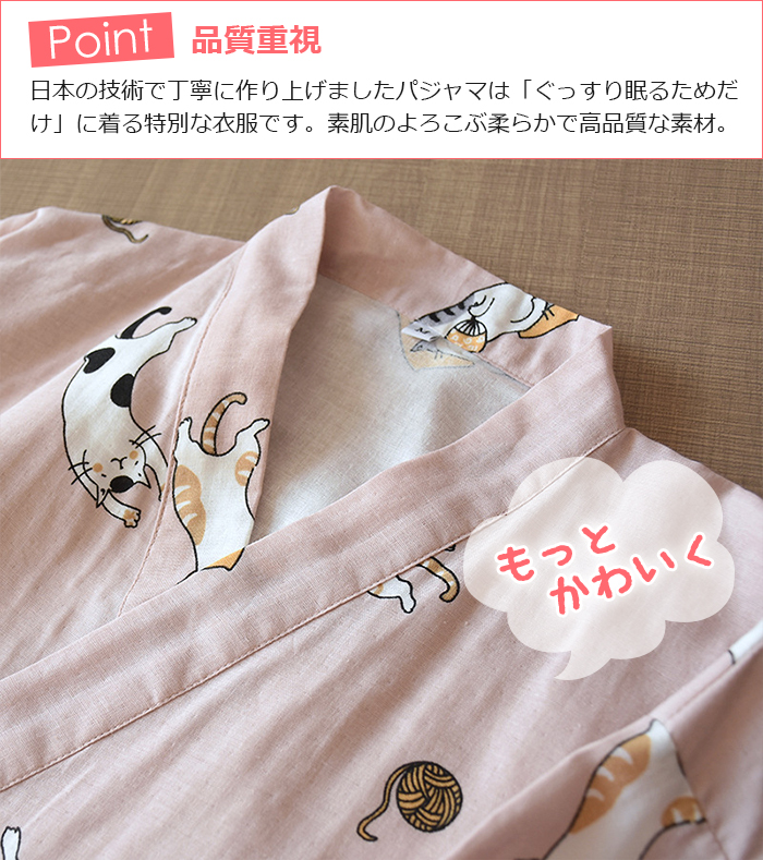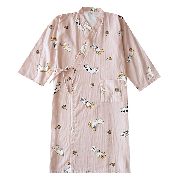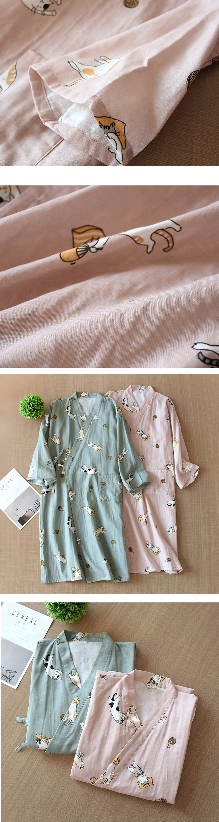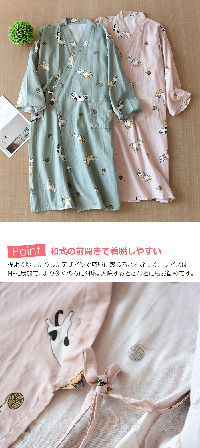 即納 男女兼用 パジャマ 綿 部屋着ワンピース ルームワンピース カップルペア 2重ガーゼ ペア 前開き 寝巻き 寝間着 インナー 前合わせ ウエア ガーゼパジャマ 入院用パジャマ 綿100% 夏 薄手 膝丈 かわいい 猫柄 グリーン/ピンク M/L 送料無料 敬老の日