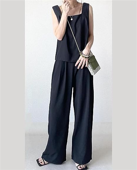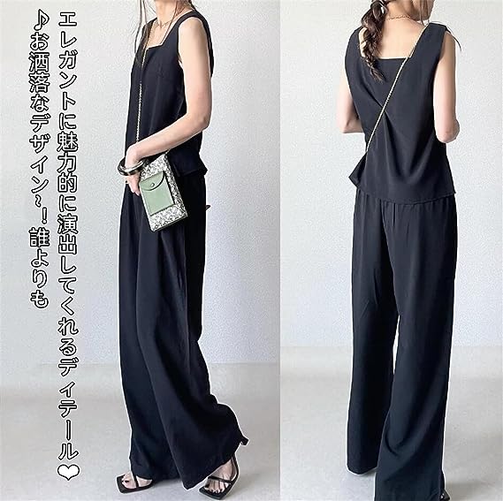 レディース セットアップ ベスト ワイドパンツ 2点セット トップス ノースリーブ tシャツ ロングパンツ 上下セット ガウチョパンツ プルオーバー パンツスーツ ズボン パンツドレス カットソー 袖なし カジュアル 夏 スクエアネック