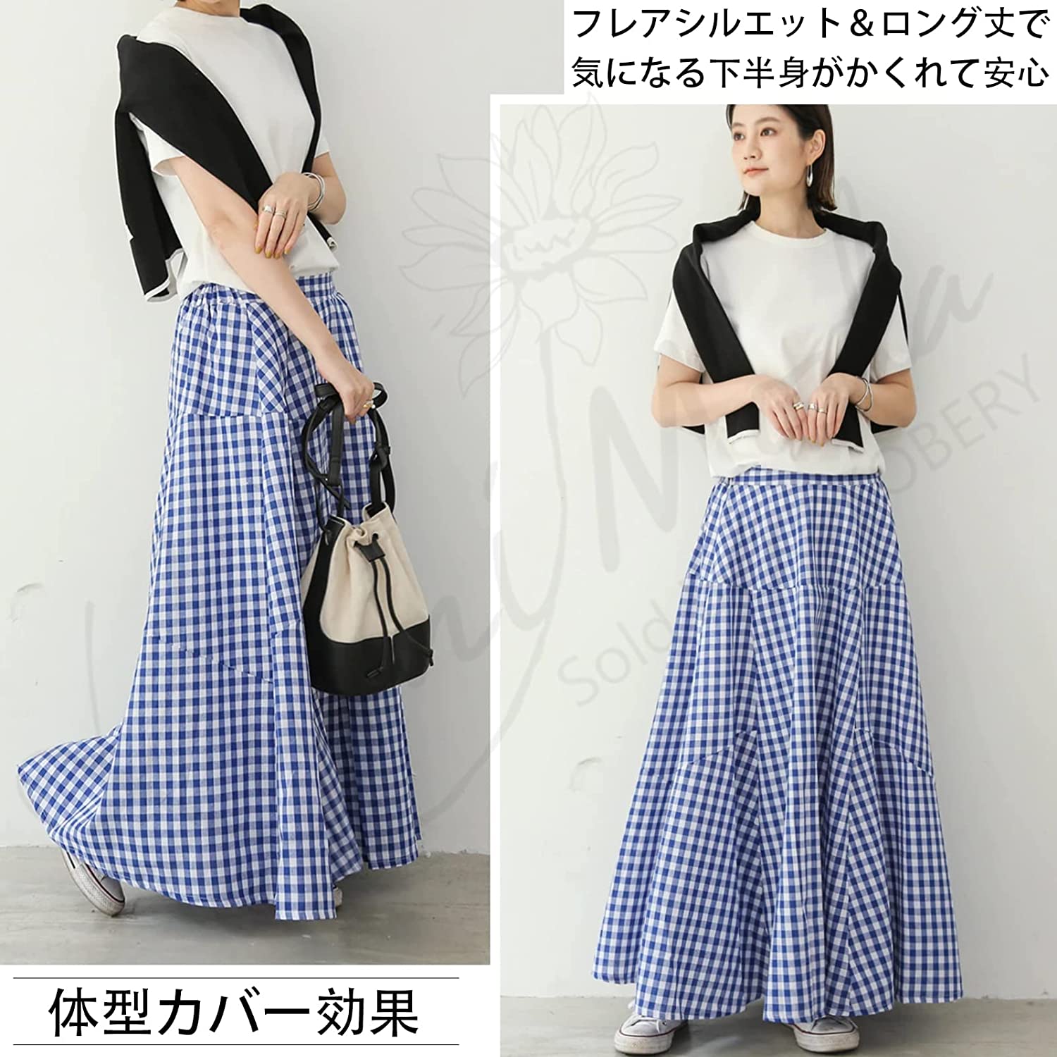 【大人っぽく可愛いこなれ感】デイリーにオールシーズン使えるロングスカート。子供っぽくならないギンガムチェックがオシャレ。10代、20代、30代と世代問わず幅広くお使い頂けます。フレアシルエット&ロング丈で 気になる下半身がかくれて安心!多少の着丈の調節もウエストの位置で調節可能! 身長やご希望の着こなしに合わせて着丈をお選びいただけます。ウエストのゴムは幅が広めになっているので、トップスをインすればウエストマークできて、着痩せ効果も期待できます。
