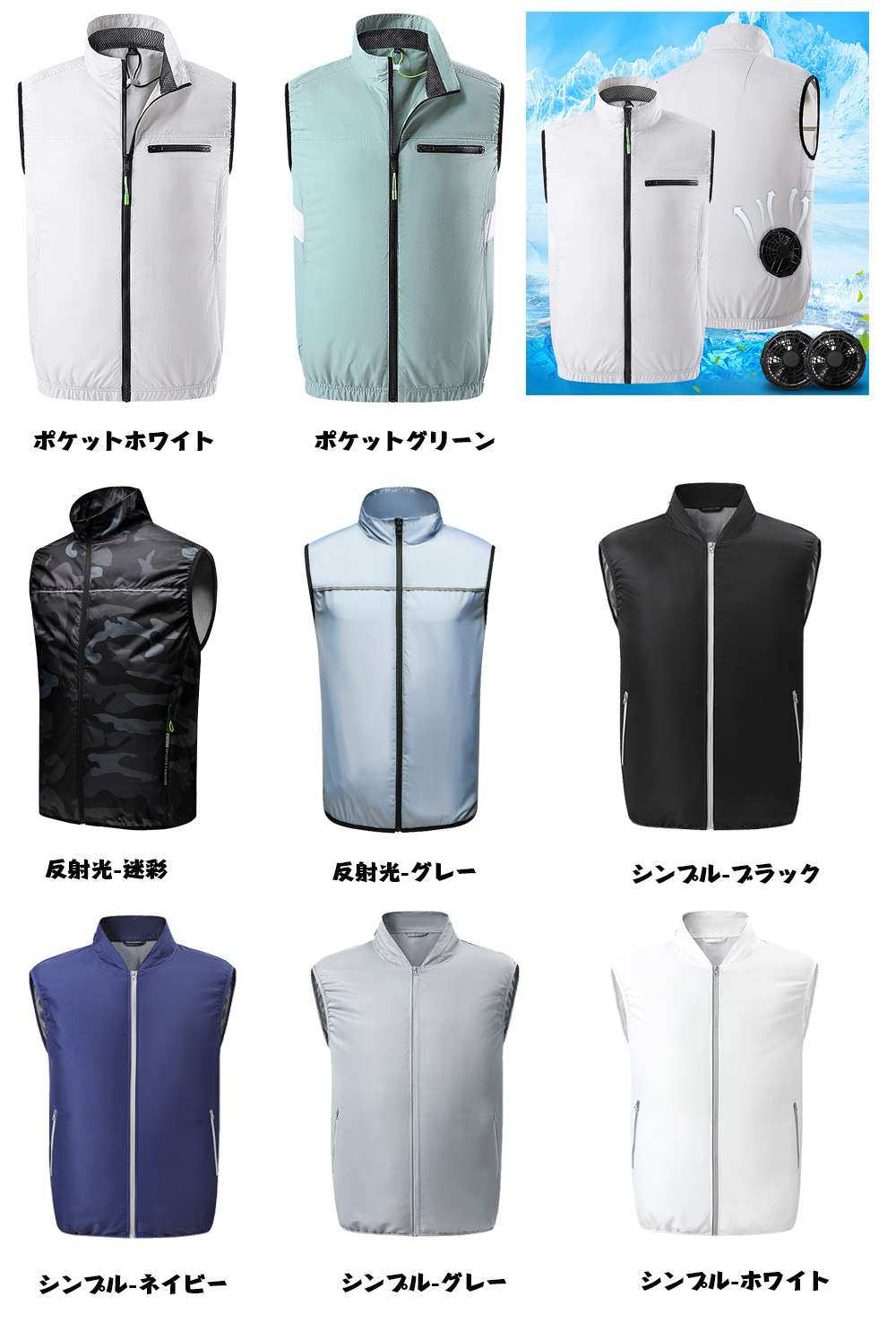 vertical-key: 帽-ライトグリーン 帽-カモフラージュ 帽-ネイビー ライトグリーン ネイビー ポケットホワイト ポケットグリーン 反射光-迷彩 反射光-グレー シンプル-ブラック シンプル-ネイビー シンプル-グレー シンプル-ホワイト