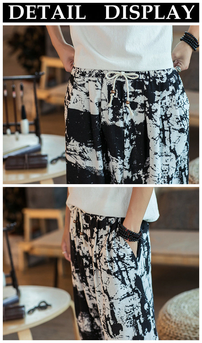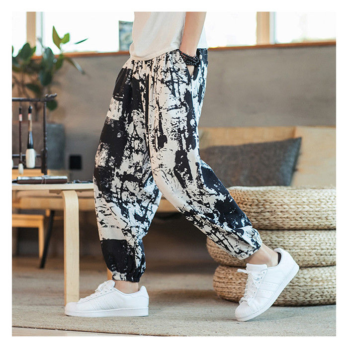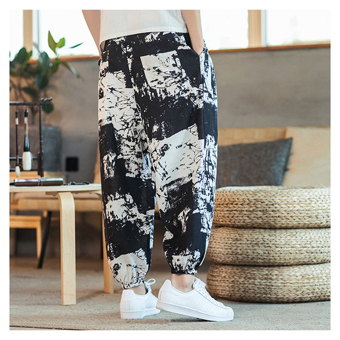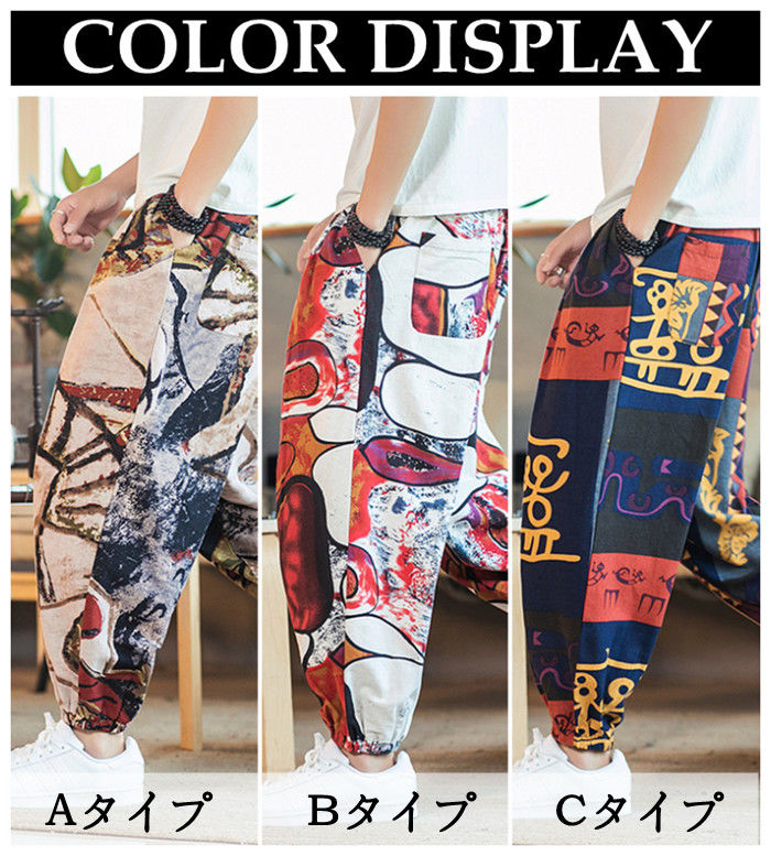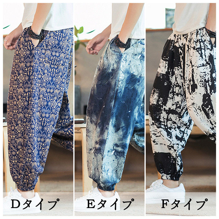 綿麻 総柄 九分丈 サルエルパンツ ハ