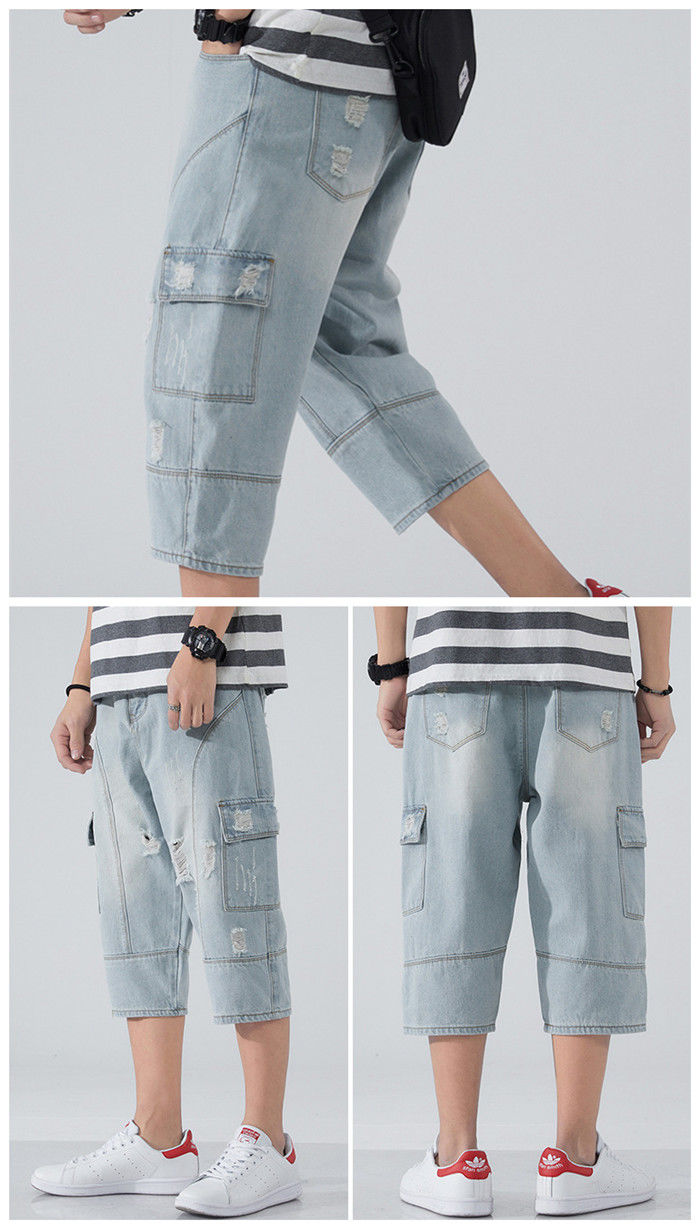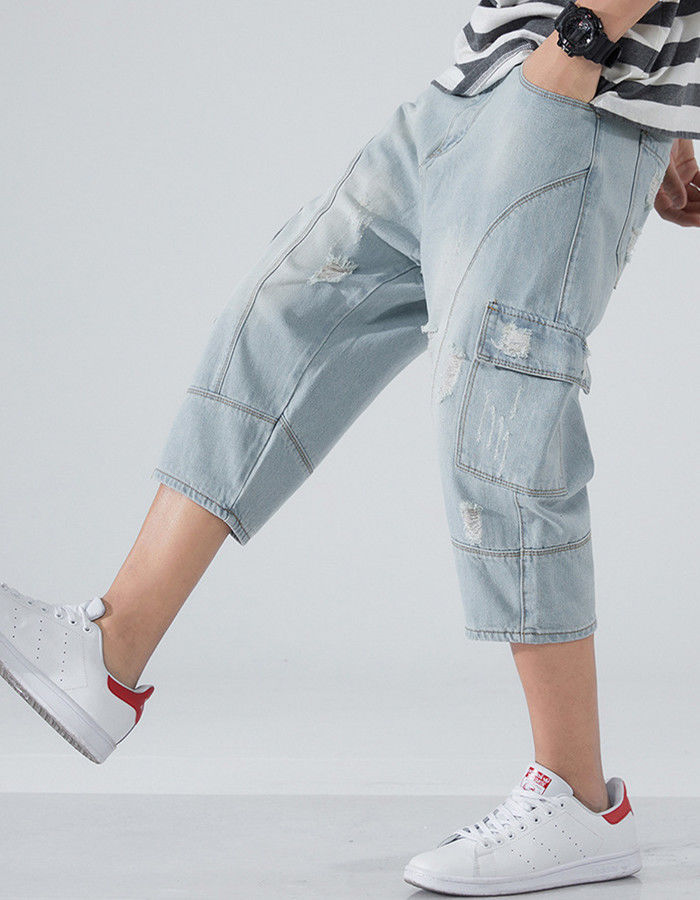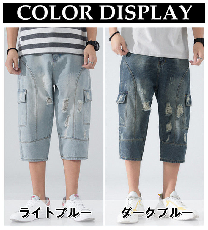 春夏新作 ジーンズ ダメージ加工 デニムパンツ 男性用 クラッシュ 七分丈パンツ ブルー 2colors