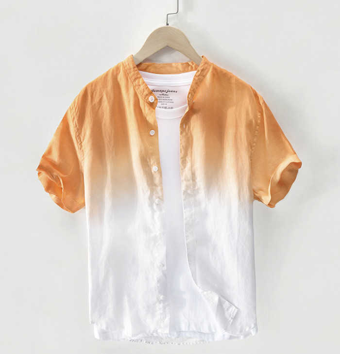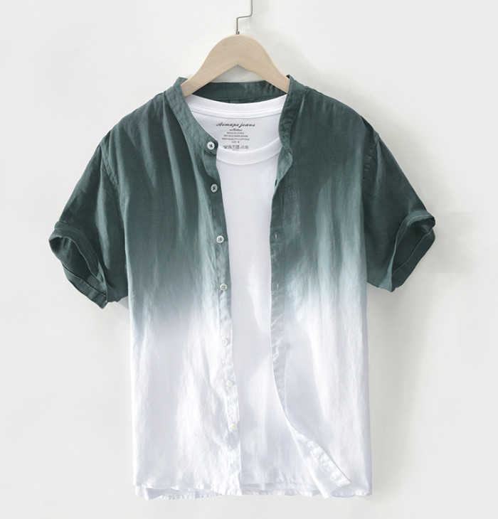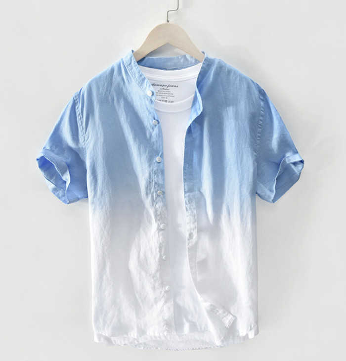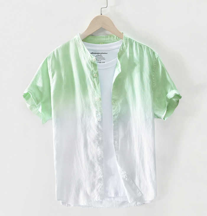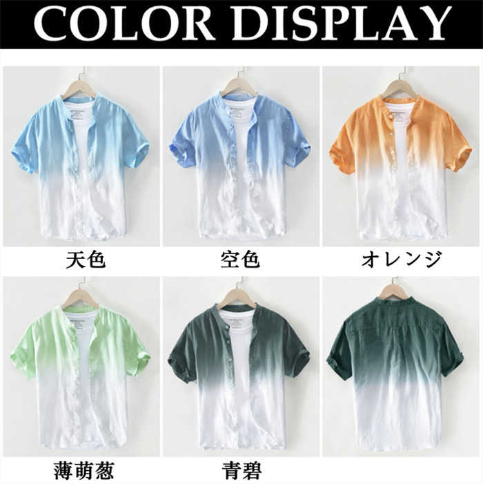 亜麻 立ち襟 半袖シャツ グラデーショ
