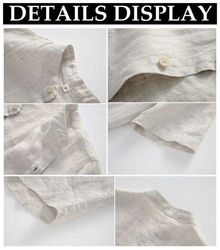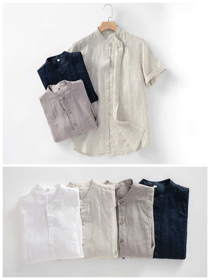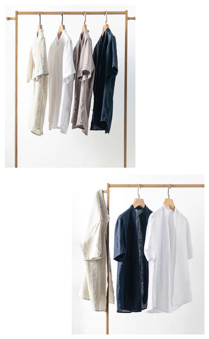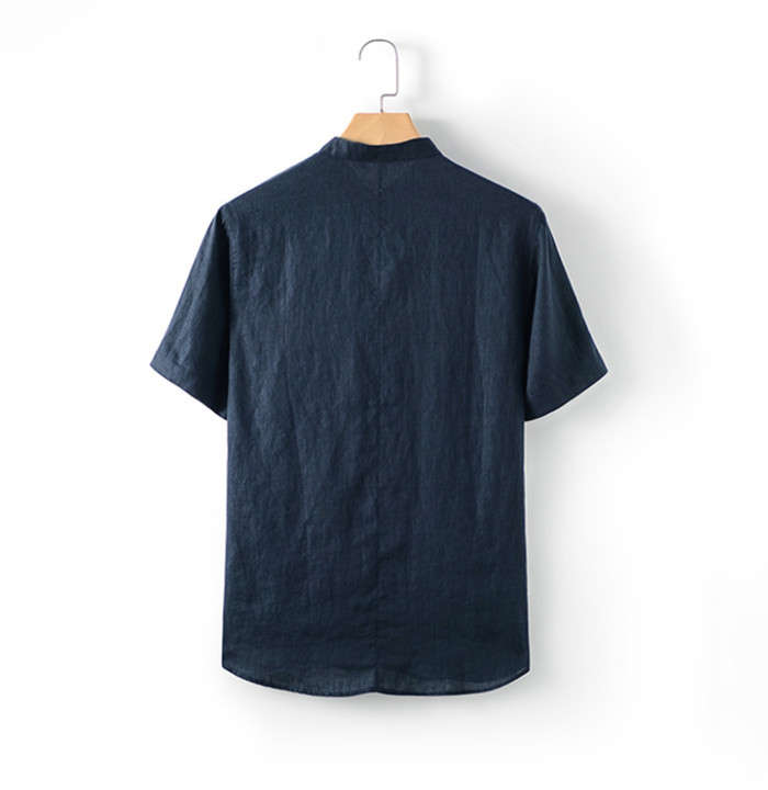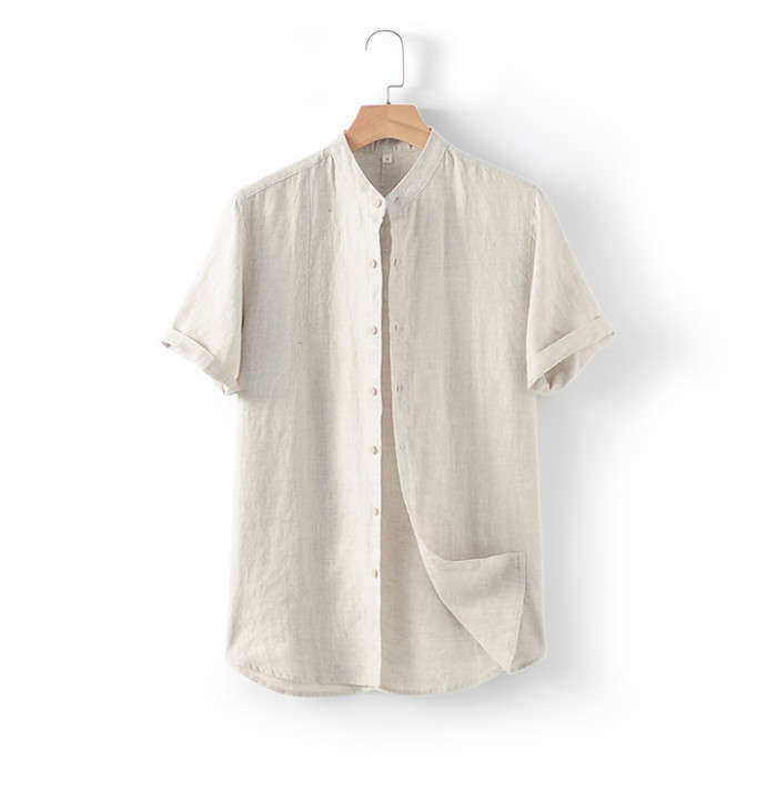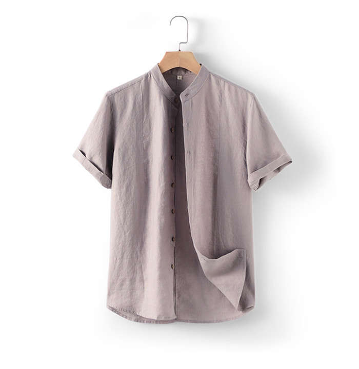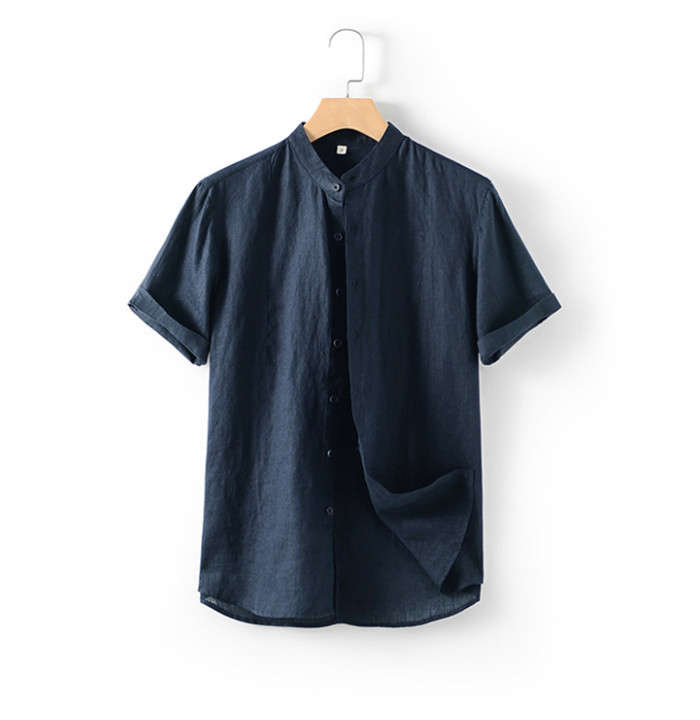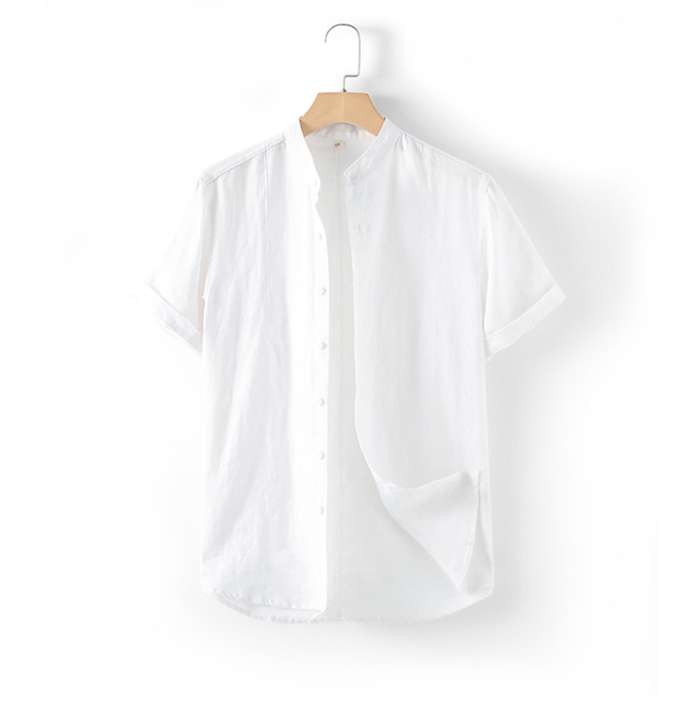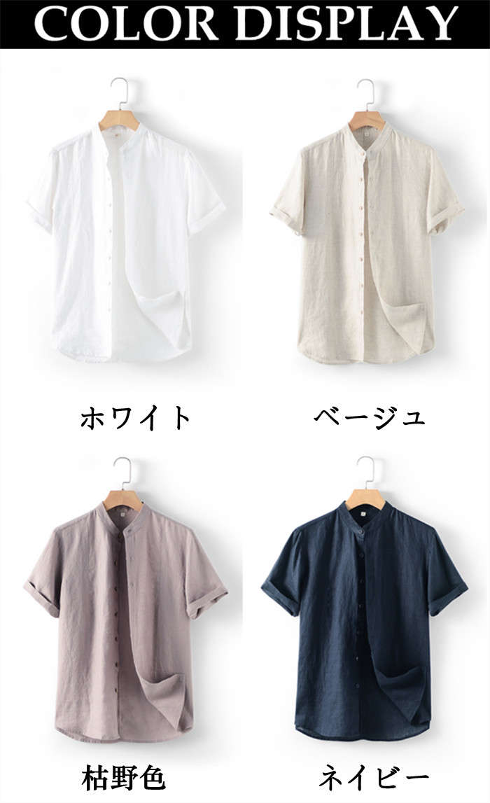 綿麻 スタンドカラー 半袖シャツ カジ