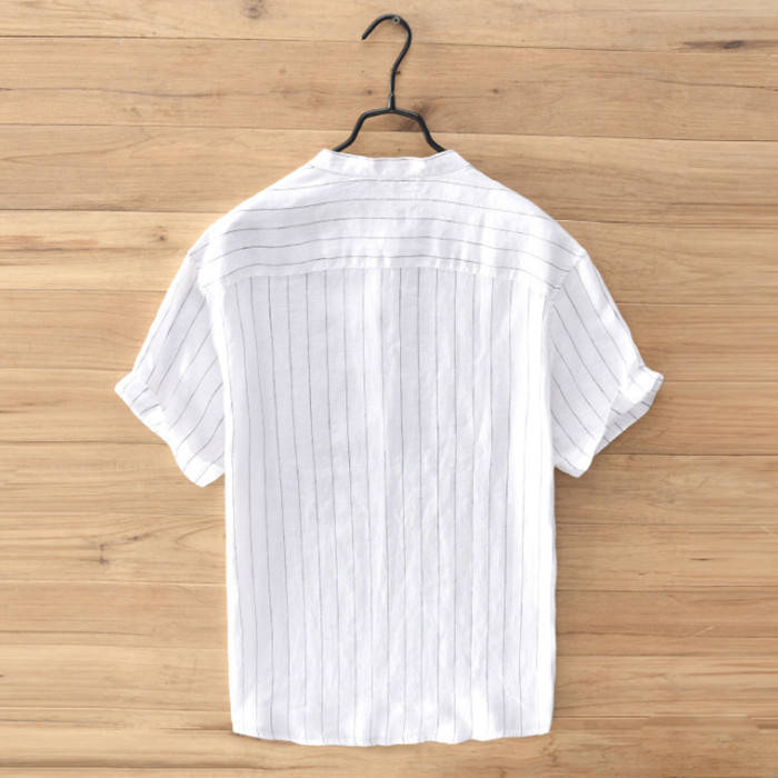 綿麻 半袖Tシャツ 立ち襟 ストライプ