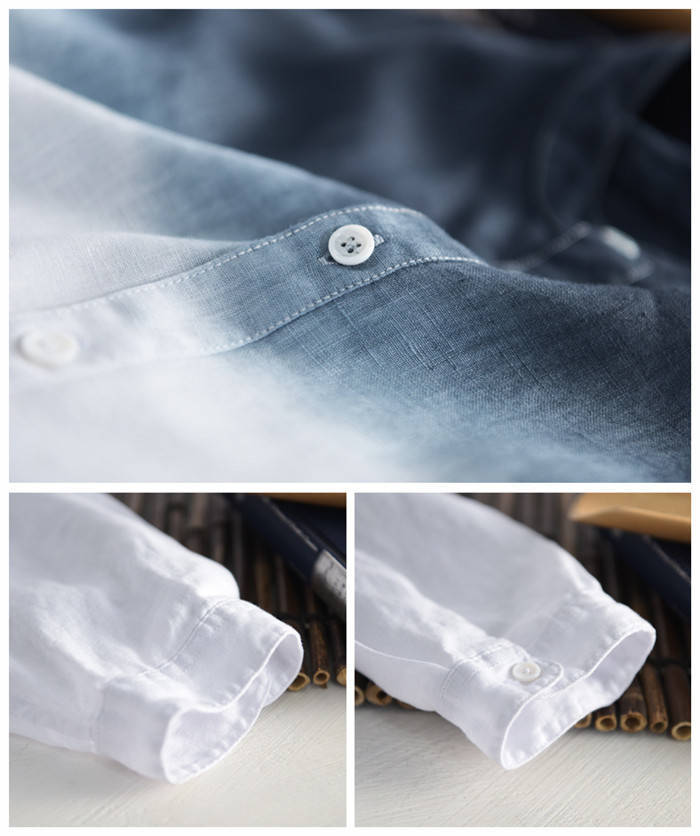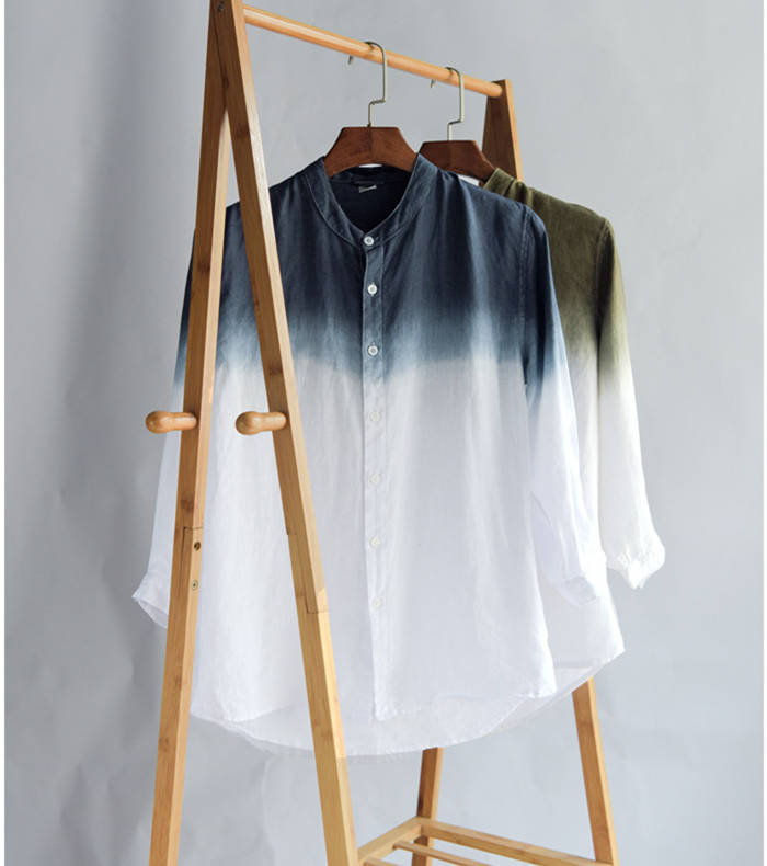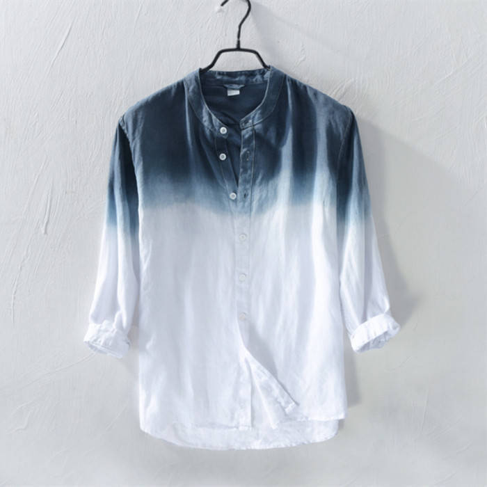 綿麻 七分袖シャツ 立ち襟 グラデーシ