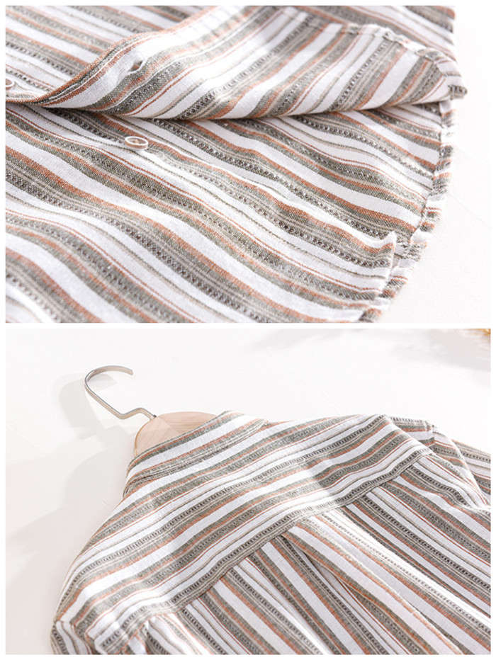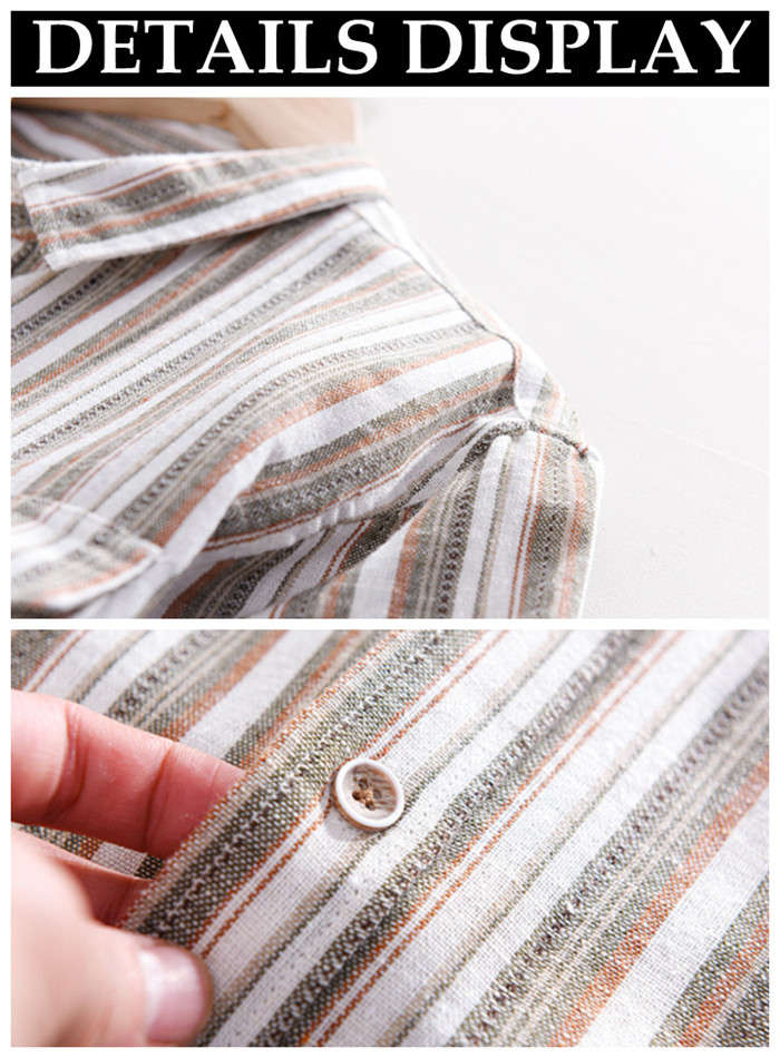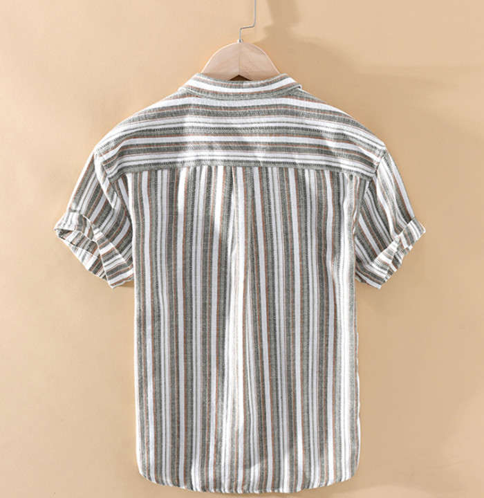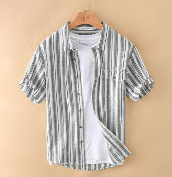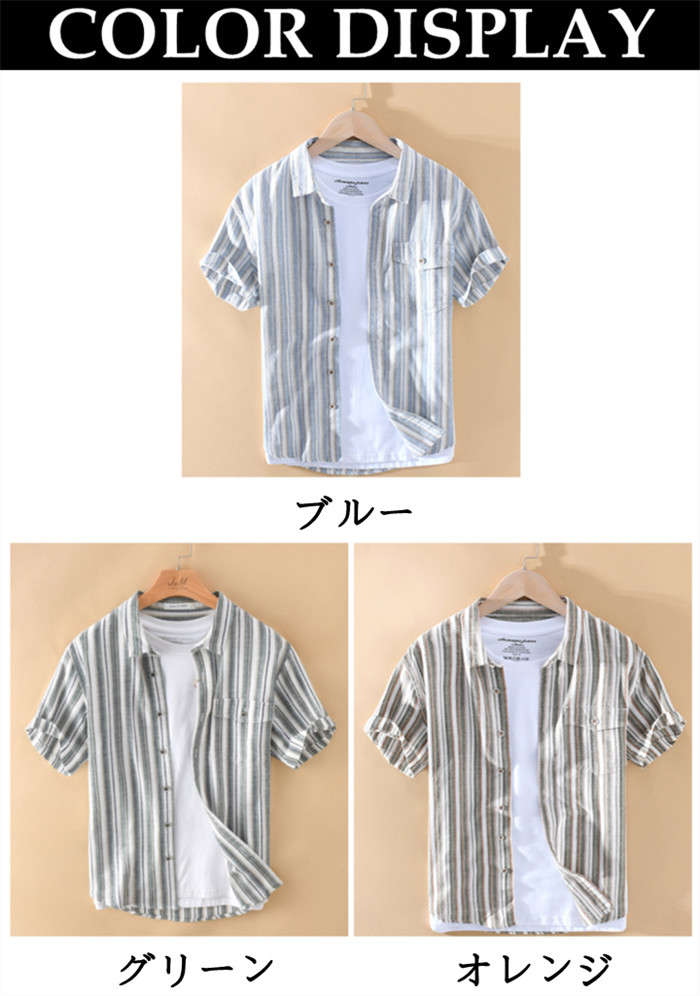 綿麻 半袖シャツ ゆったり ストライプ柄 カジュアル 男性用 トップス 夏物 2色 藍色メンズファッション トップス カジュアルシャツ