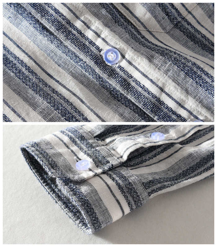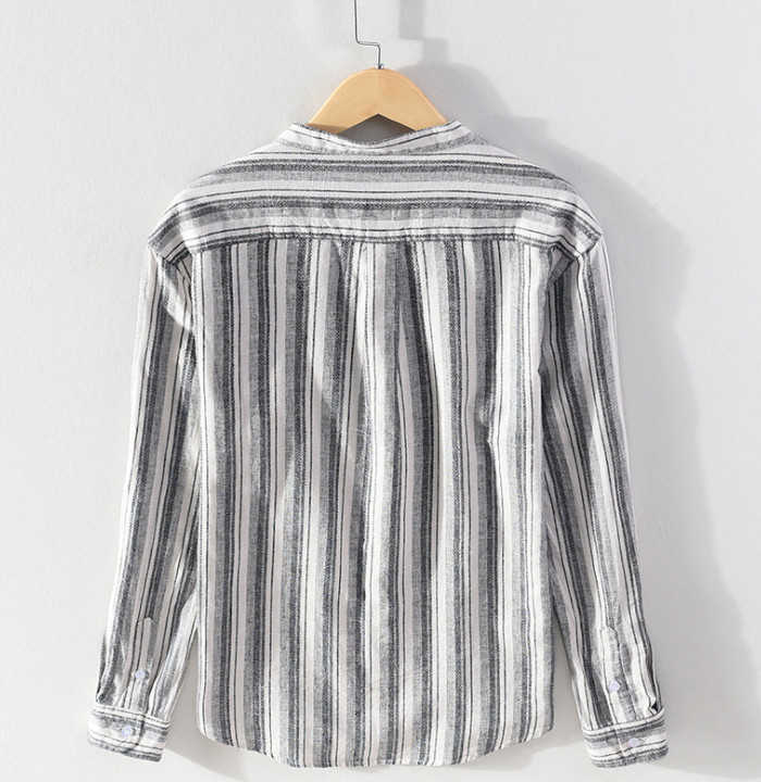 綿麻 ストライプ柄 立ち襟 長袖シャツ