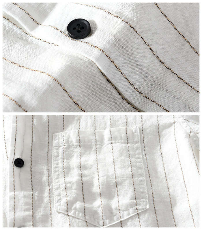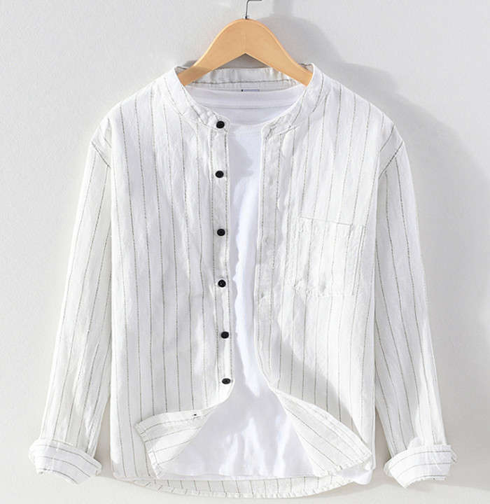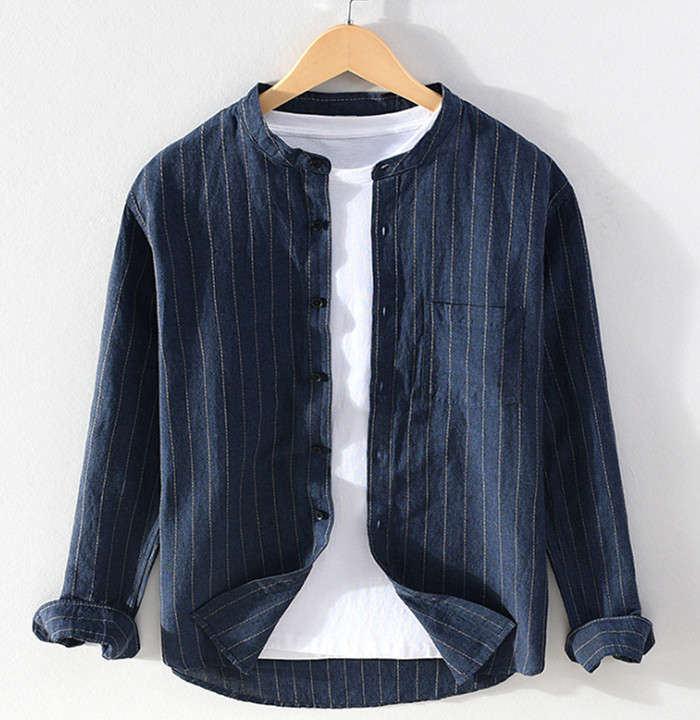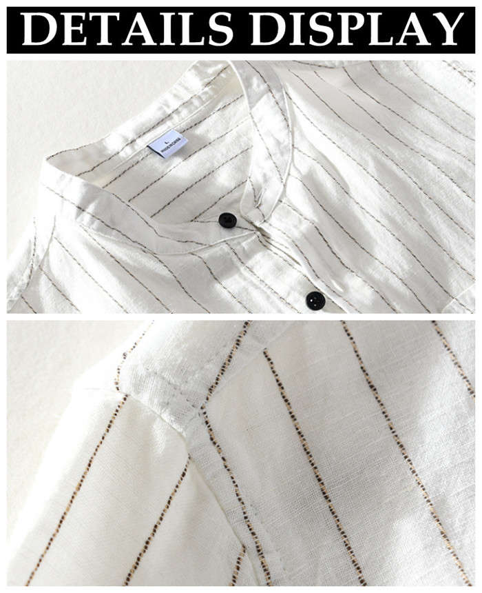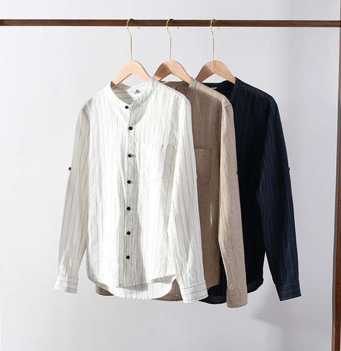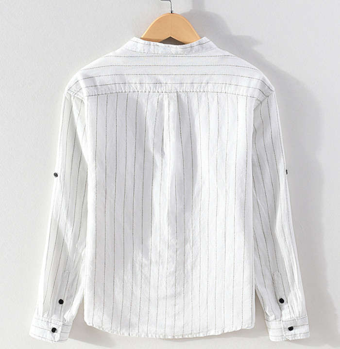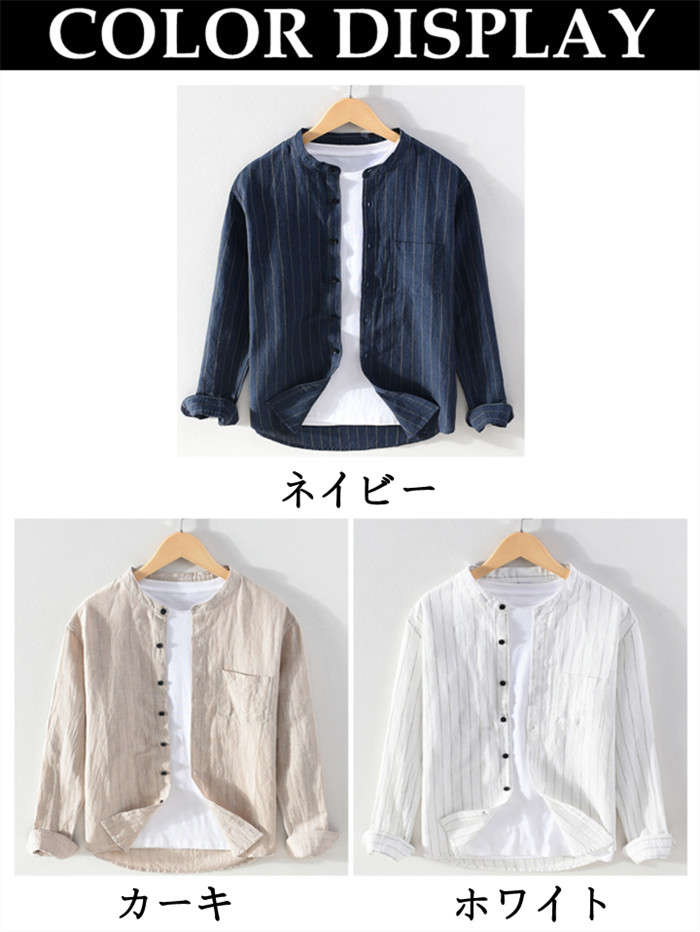 綿麻 ストライプ柄 立ち襟 長袖シャツ
