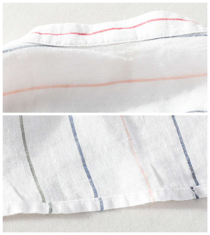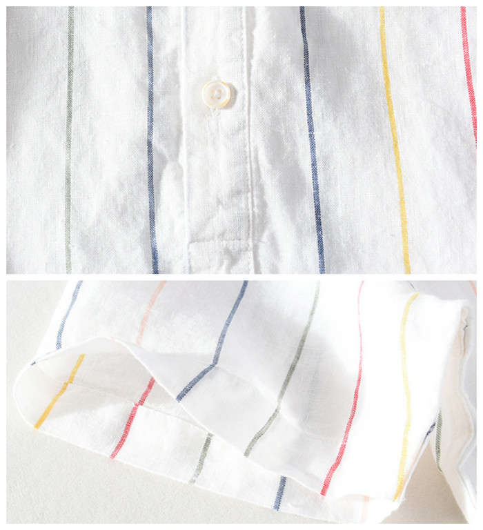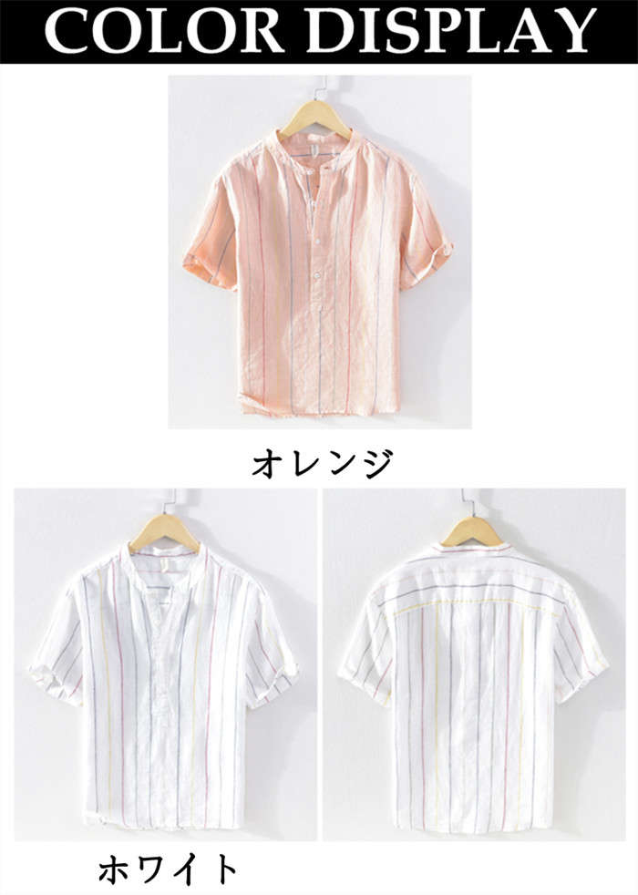 綿麻 ストライプ柄 半袖Tシャツ 立ち