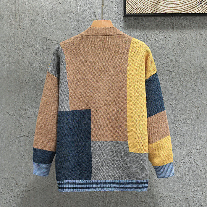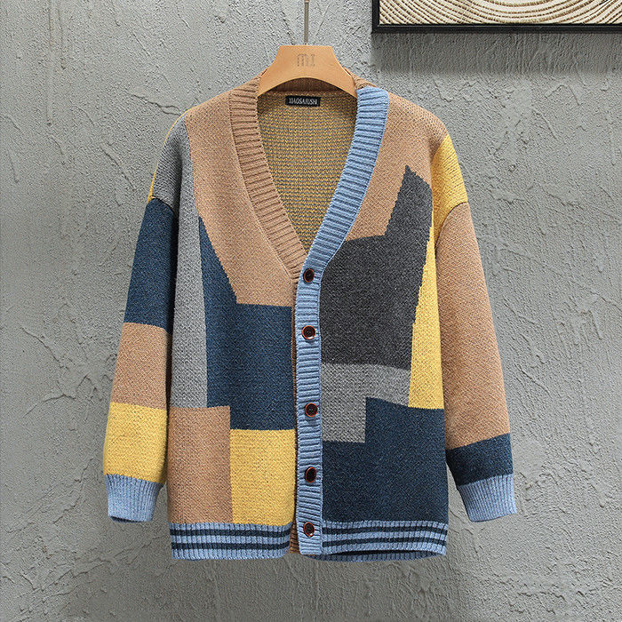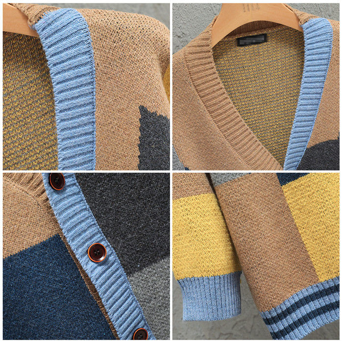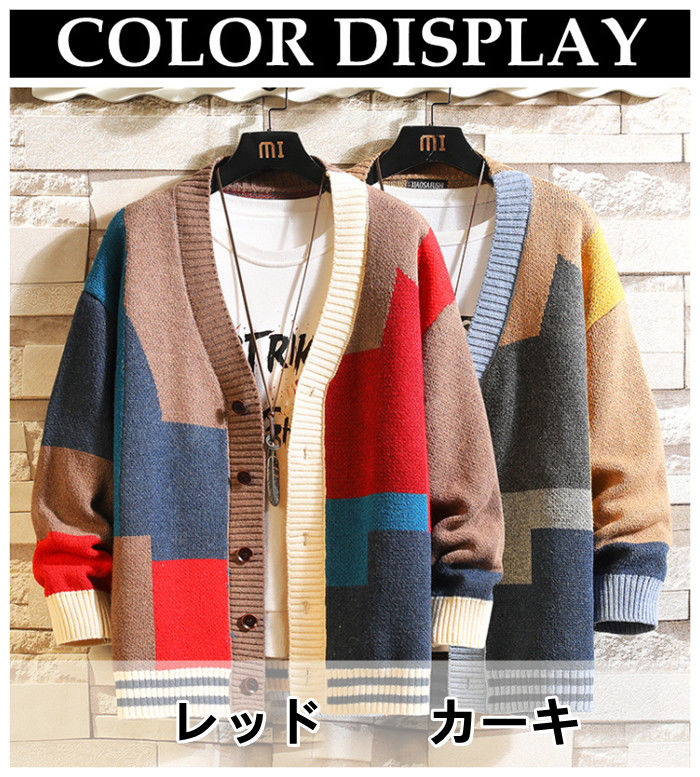 大きいサイズ カーデ Vネック カーディガン 幾何柄 ニット アウター 秋冬新作 2色 赤色メンズファッション トップス カーディガン