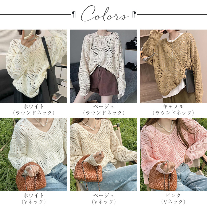 Key1: ホワイト(ラウンドネック) ベージュ(ラウンドネック) キャメル(ラウンドネック) ホワイト(Vネック) ベージュ(Vネック) ピンク(Vネック)