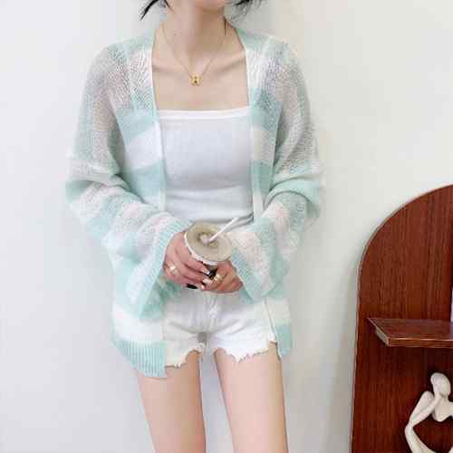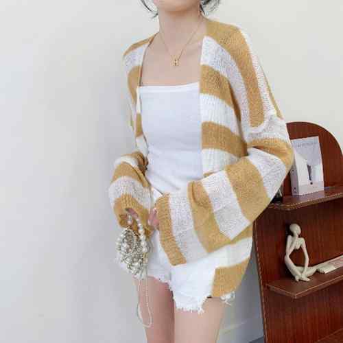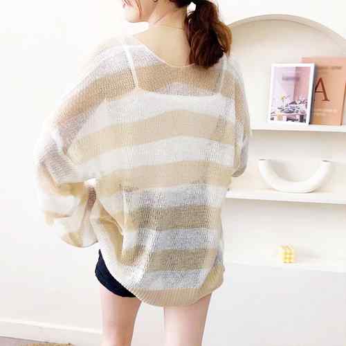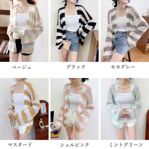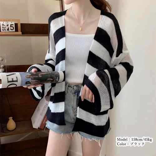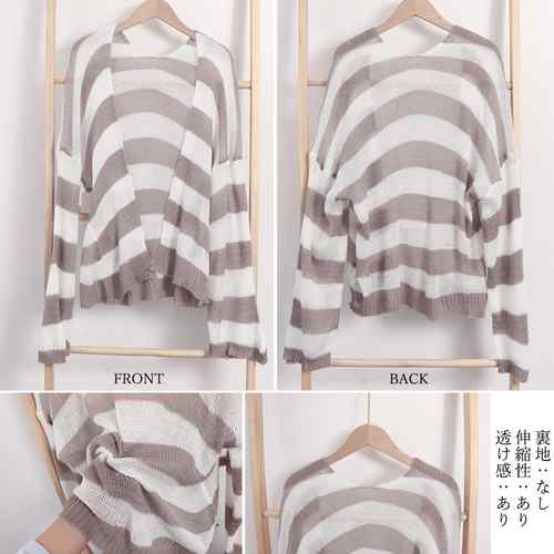 ニット羽織り 透け編み ボーダー柄ボレ