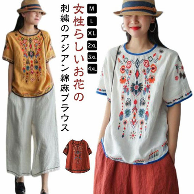 ブラウス M~4XL ナチュラル ブラウス エスニック調 快適 薄手 綿麻レディースファッション トップス Tシャツ カットソー