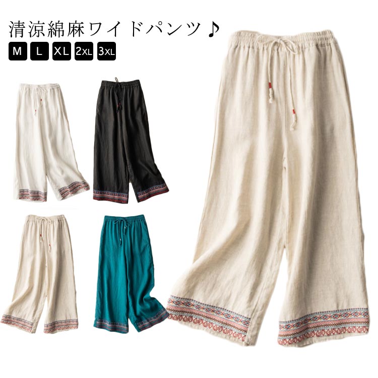 刺繍 ロングパンツ カジュアルパンツ きれいめ 可愛い ガウチョパンツ 30代 40代 50代 60代