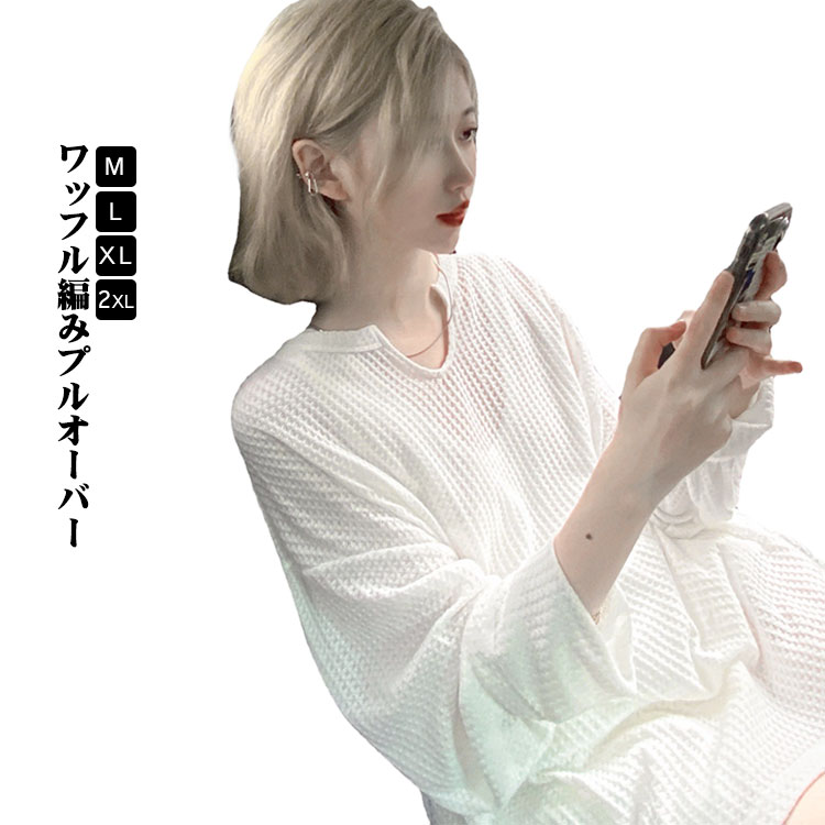 長袖 クルーネック レディース トップス ドロップショルダー オーバーサイズ Vネック 楽ちん ゆったり シンプル ワッフル 無地 カジュアル 抜け感 春 秋