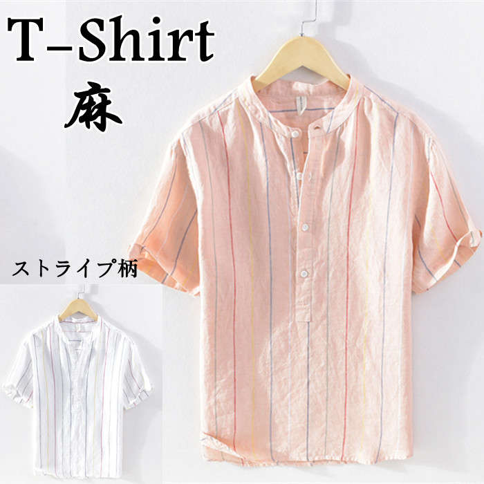 綿麻 ストライプ柄 半袖Tシャツ 立ち襟 カジュアル 男性用 トップス 夏物 2色 白色メンズファッション トップス Tシャツ カットソー