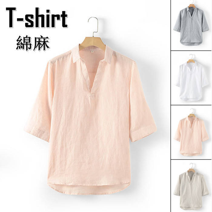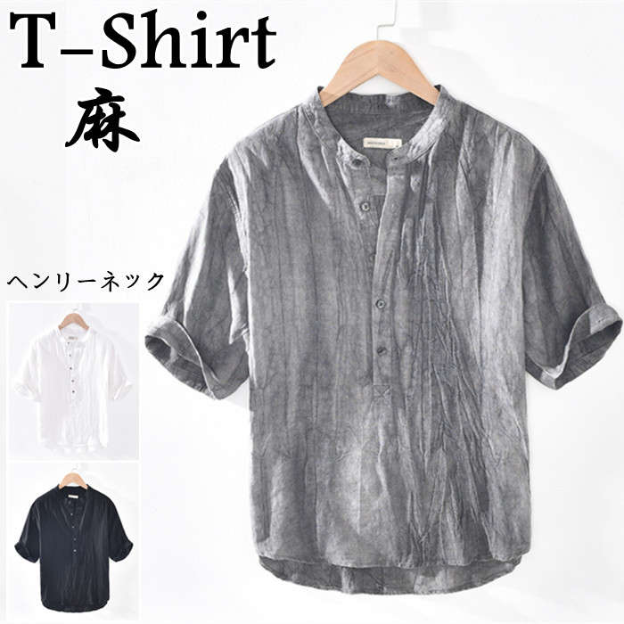 亜麻 半袖シャツ 五分袖 ヘンリーネック 立ち襟 カジュアル 男性用 トップス 夏服 3色 白色 灰色 黒色