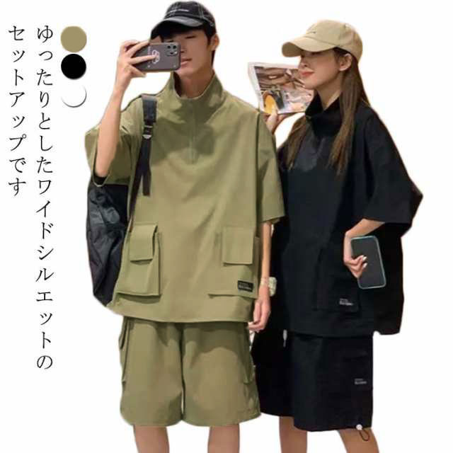 メンズ ビッグシルエット 半袖 接触冷感 ハーフパンツ セットアップ 半袖シャツ スポーツウェア ジャージ 薄手 凉しい 夏 ゆったり 大きいサイズ 上下セット カジュアル 伸縮性 無地 アウトドア