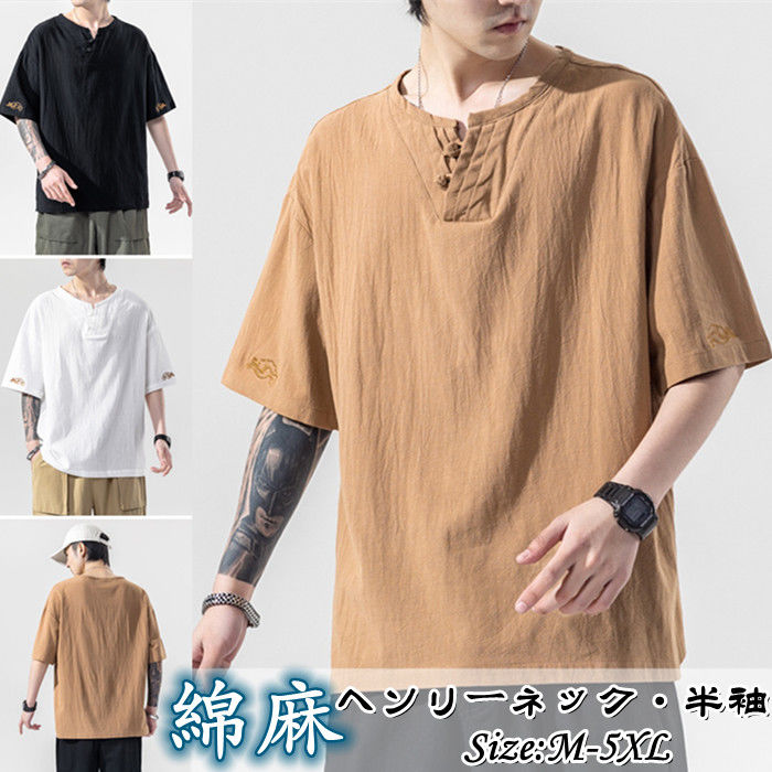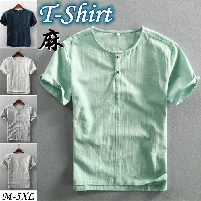 Tシャツ リネンTシャツ 半袖Tシャツ メンズ ヘンリーネック カジュアルTシャツ - -5 綿麻 トップス シンプル 無地 夏物 新品