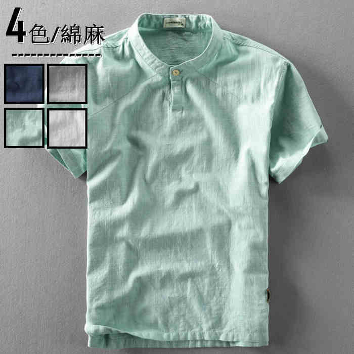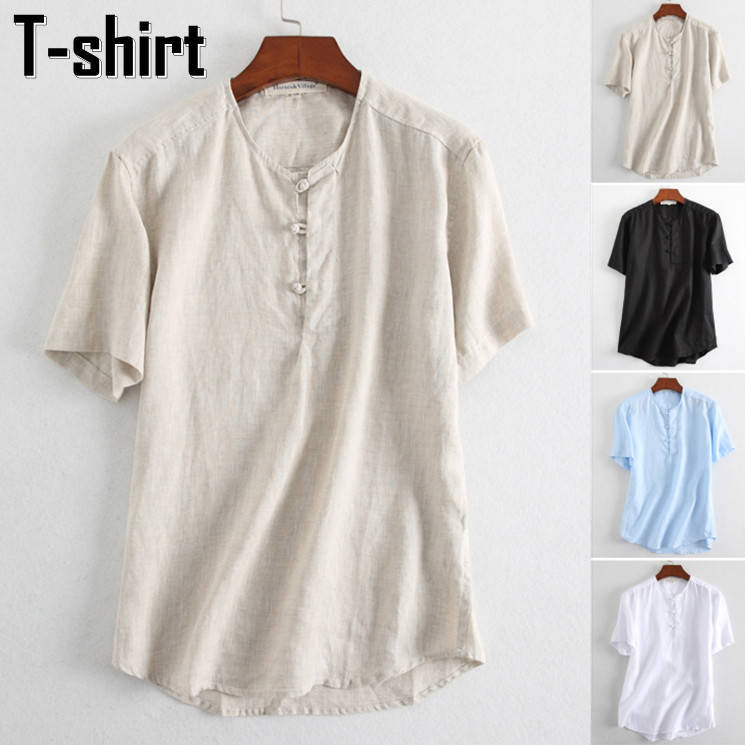 綿麻 立ち襟 半袖Tシャツ カジュアル ヘンリーネック トップス 男性用 夏物 3色 白色 黒色メンズファッション トップス シャツ カットソー